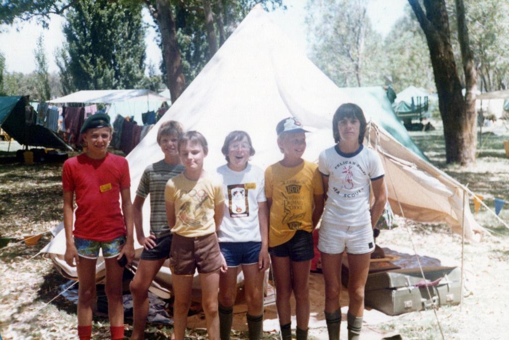 Coloured photograph: Group photograph of six male scouts standing in front of a tent in bushland setting. Other tents are visible in the background.