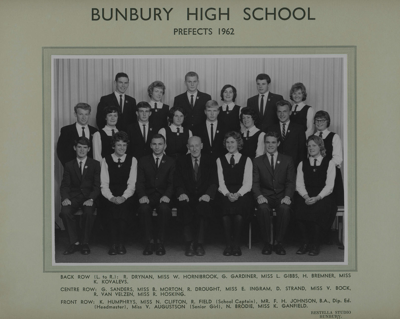 1962Studio portrait of the 1962 Bunbury High School Prefects with headmaster Frederick Johnson.