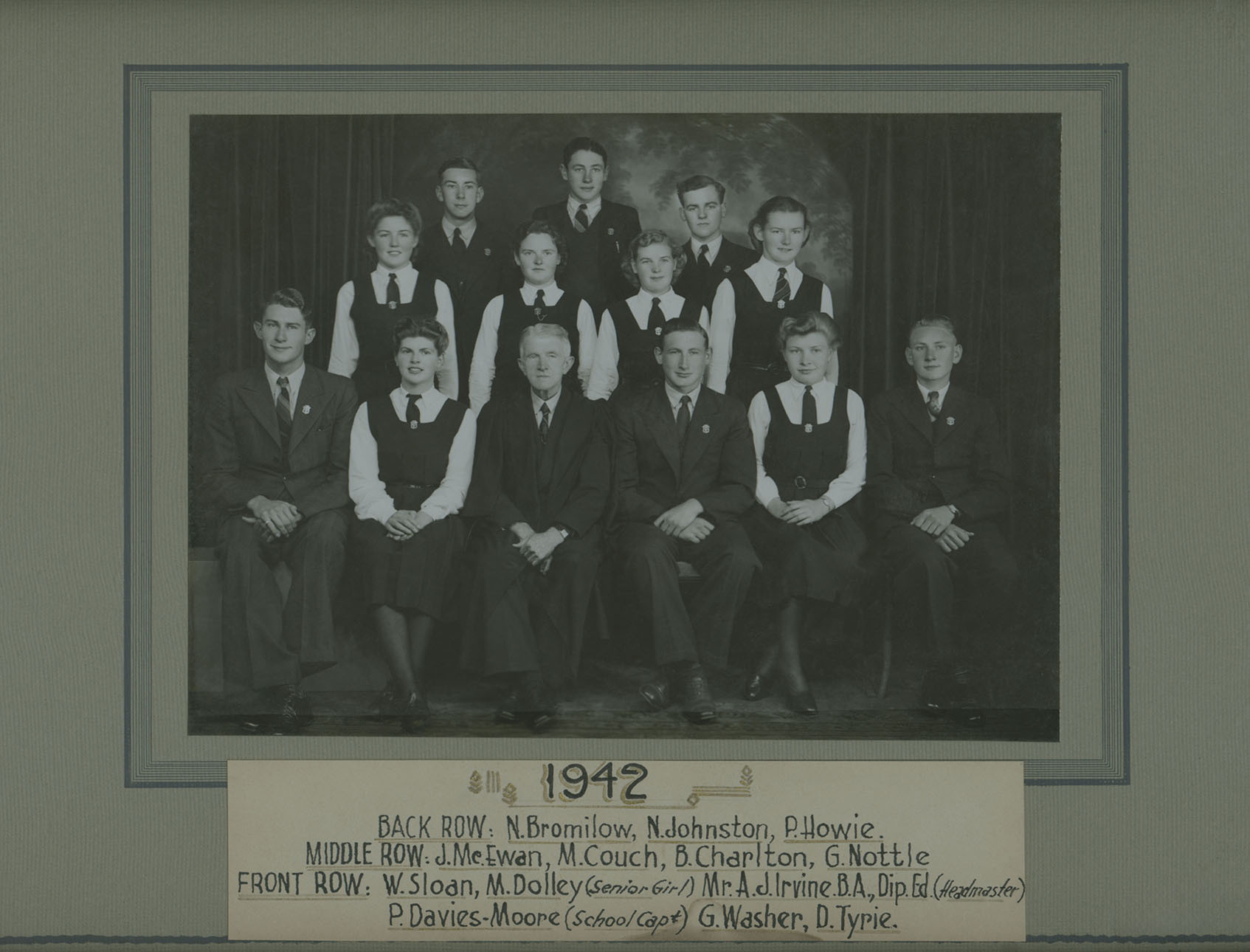 Front: W. Sloan, Marion Dolley (Senior Girl), Arthur J. Irvine (Headmaster), Peter Davies-Moore (School Captain), Gladys Washer, Douglas Tyrie.