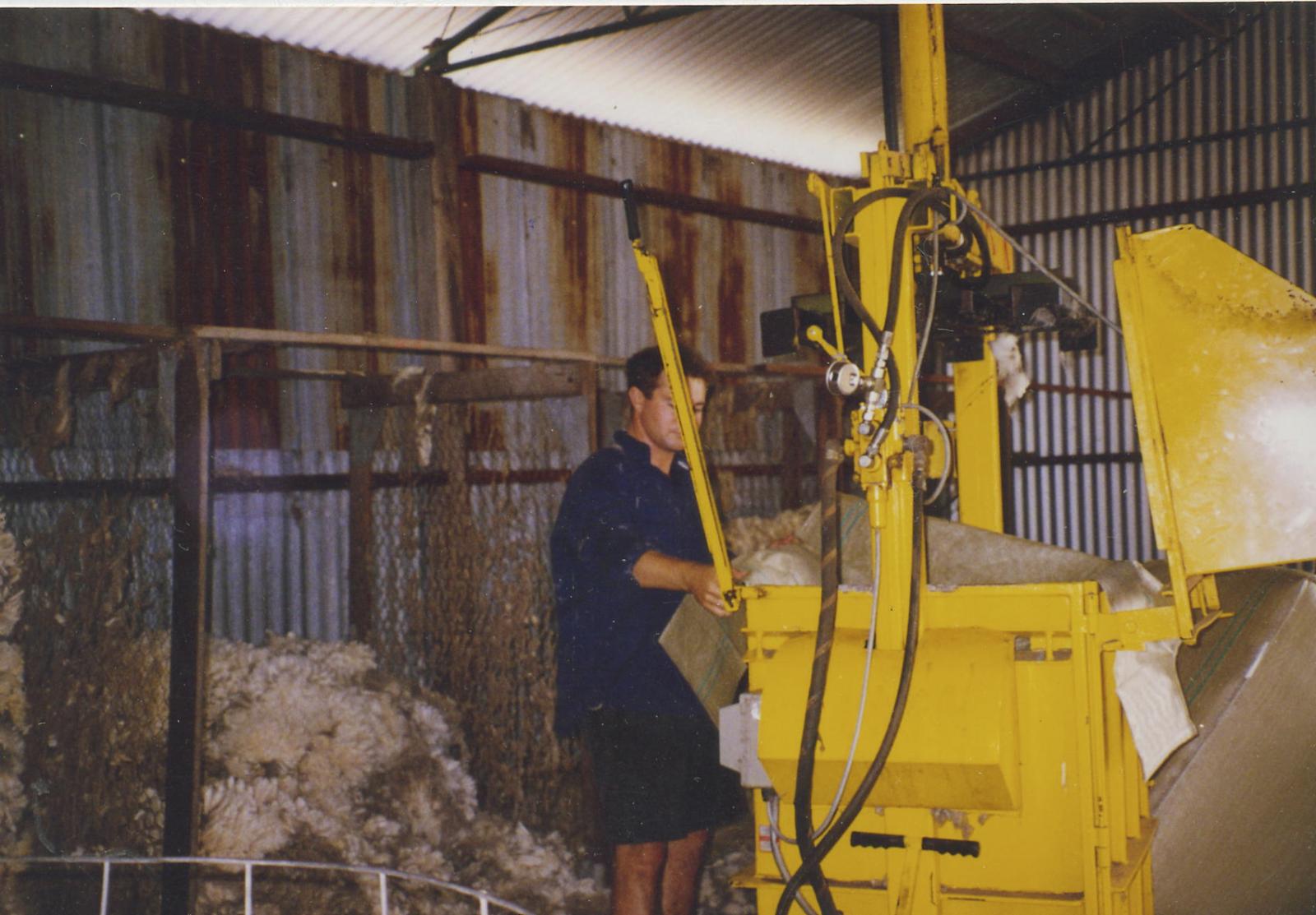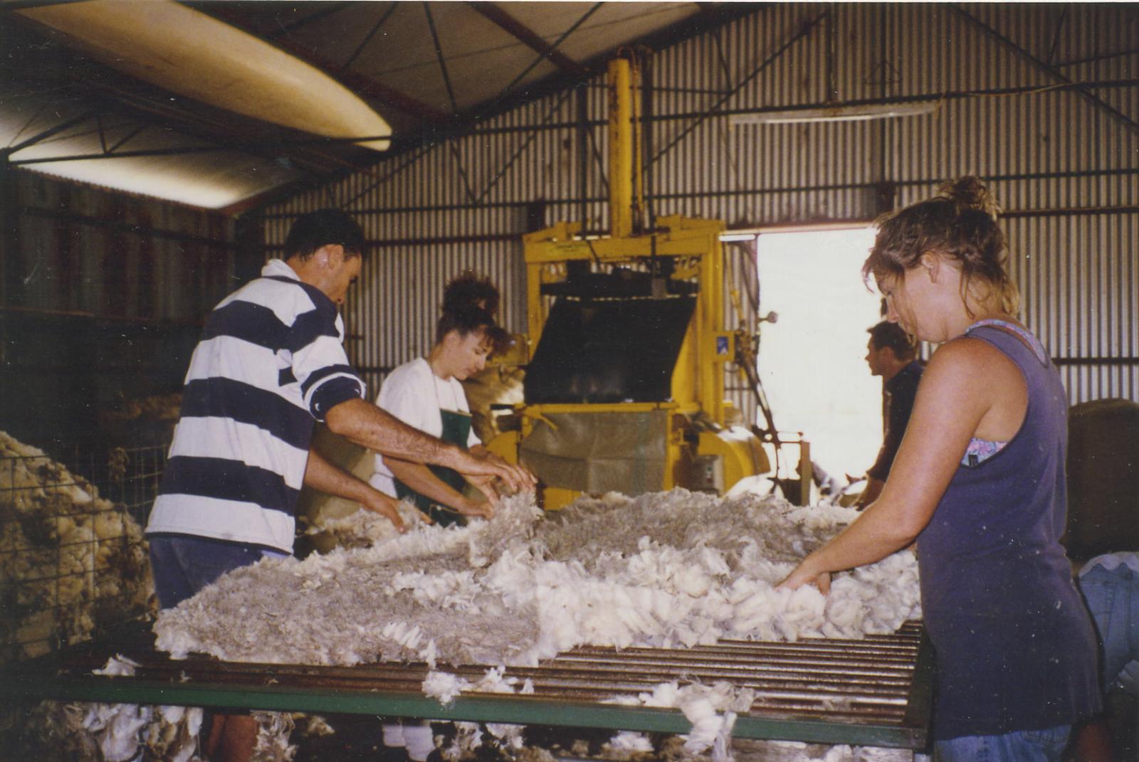 1994Skirting the wool at shearing time at 'Fairbanks' Shamrock Road 1994. Cambell Clifton at wool press. Farm owned by Ian and Robyn Clifton.