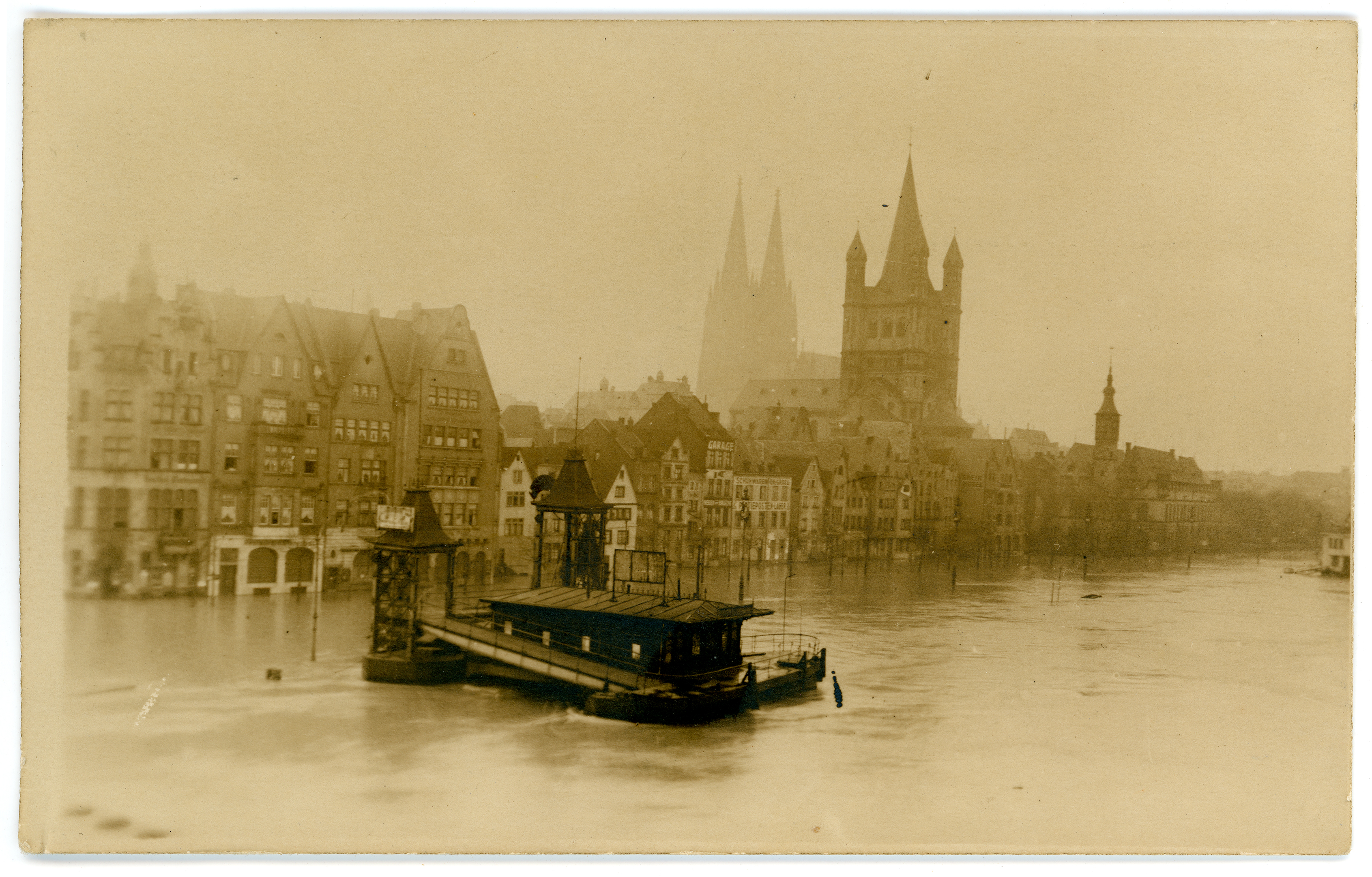 c. 1920First World War black and white German photographic postcard of Rhine river flood, c.1920, view of Cologne Cathedral in background.