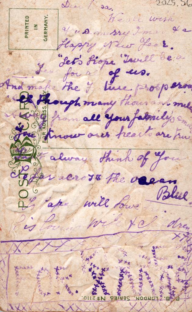 Poscard with saturated image od two pale pink roses with green leaves. The flowers are in one half of the image, with a large area of blank space in the other half. The reverse has a hand written messafe in blue ink which reads: 'Dear Papa, / We all wish / you a Merry Xmas & a / Happy New Year. / 'Let’s hope it will be a / New [underlined] Year for allof us. / And make the future prosperous / All through many thousand miles / A way from all your family's smiles / You know our hears are true / Shall always think of you / so far across the ocean blue / To Papa with love from / his loving wife & children'. 'KISSES / FOR XMAS' is written in the bottom with lots of little X-es and a border with even more X-es.