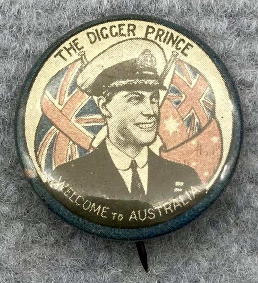 Souvenir button welcoming 'The Digger Prince' to Australia