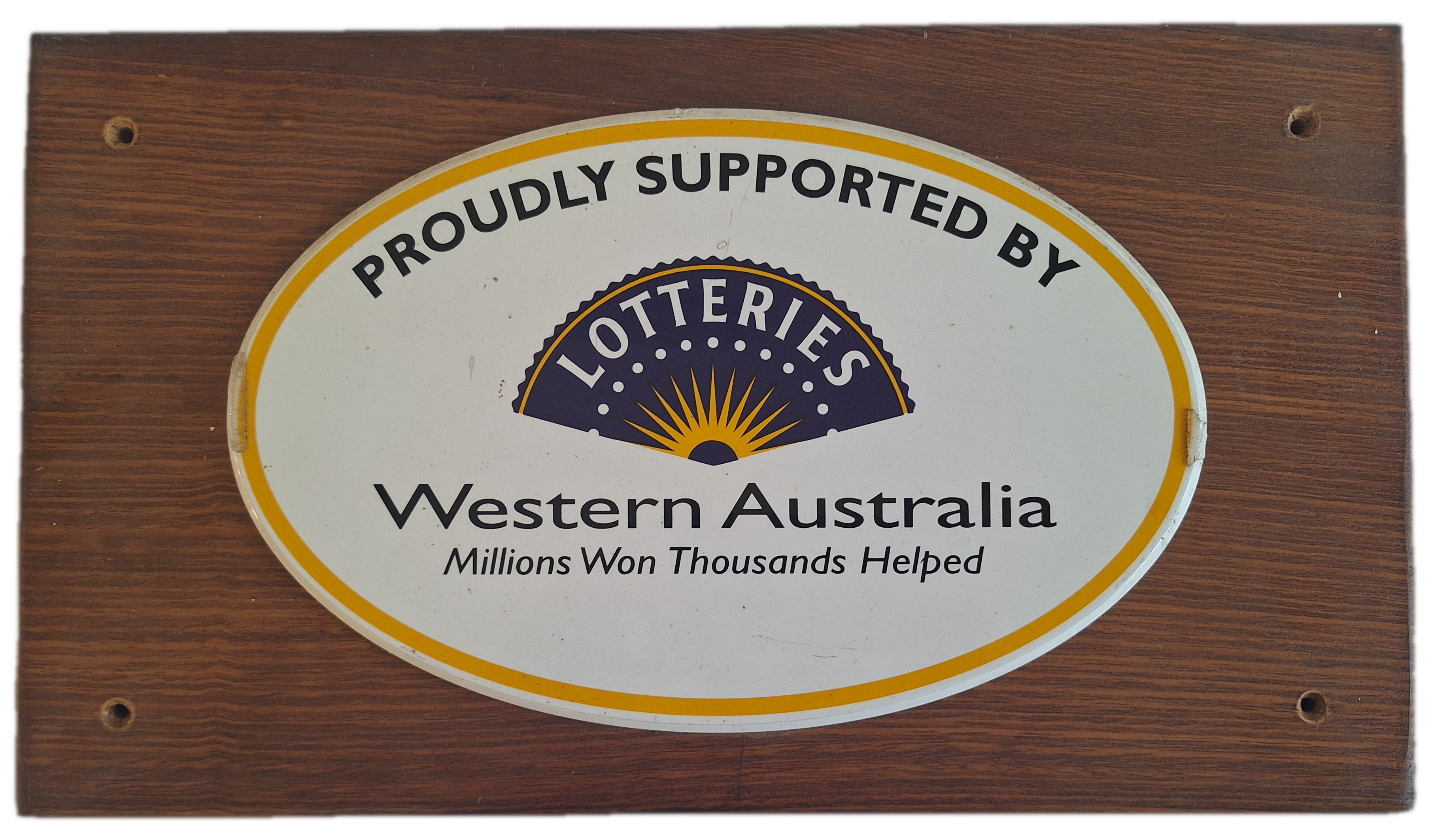 A heavy wooden plaque with a plastic/ceramic label to notify of support from Lotteries WA