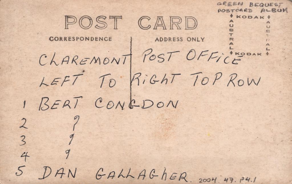 Reverse: Written in black pen 'CLAREMONT POST OFFICE LEFT TO RIGHT TOP ROW' and '1 BERT CONGDON, 2 ?, 3 ?, 4 ?, 5 Dan GALLAGHER'