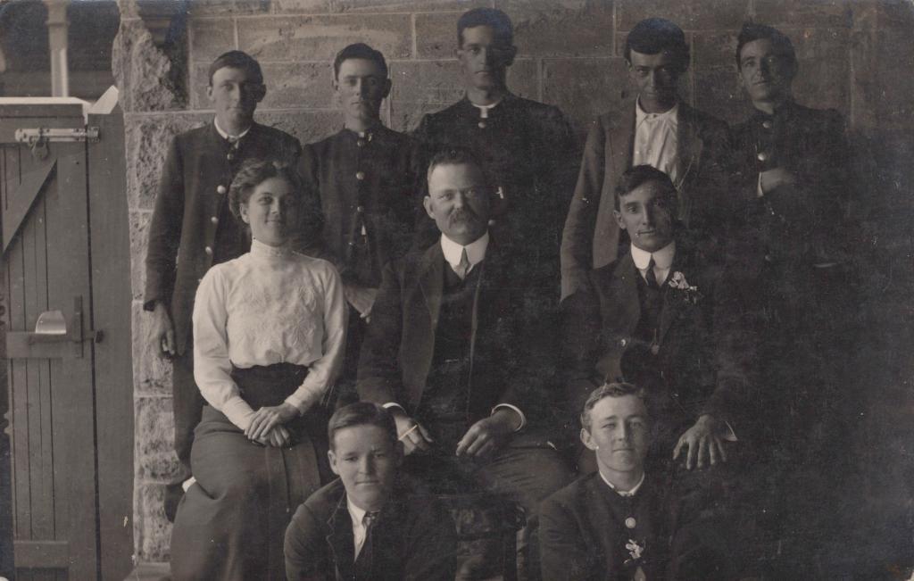 c. 1913Postcard showing a group of people posing in front of the camera. They are divided into three rows. Bert Congdon is seen standing to the left in the back row. Dan Gallagher is seen standingto the right in the back row.
