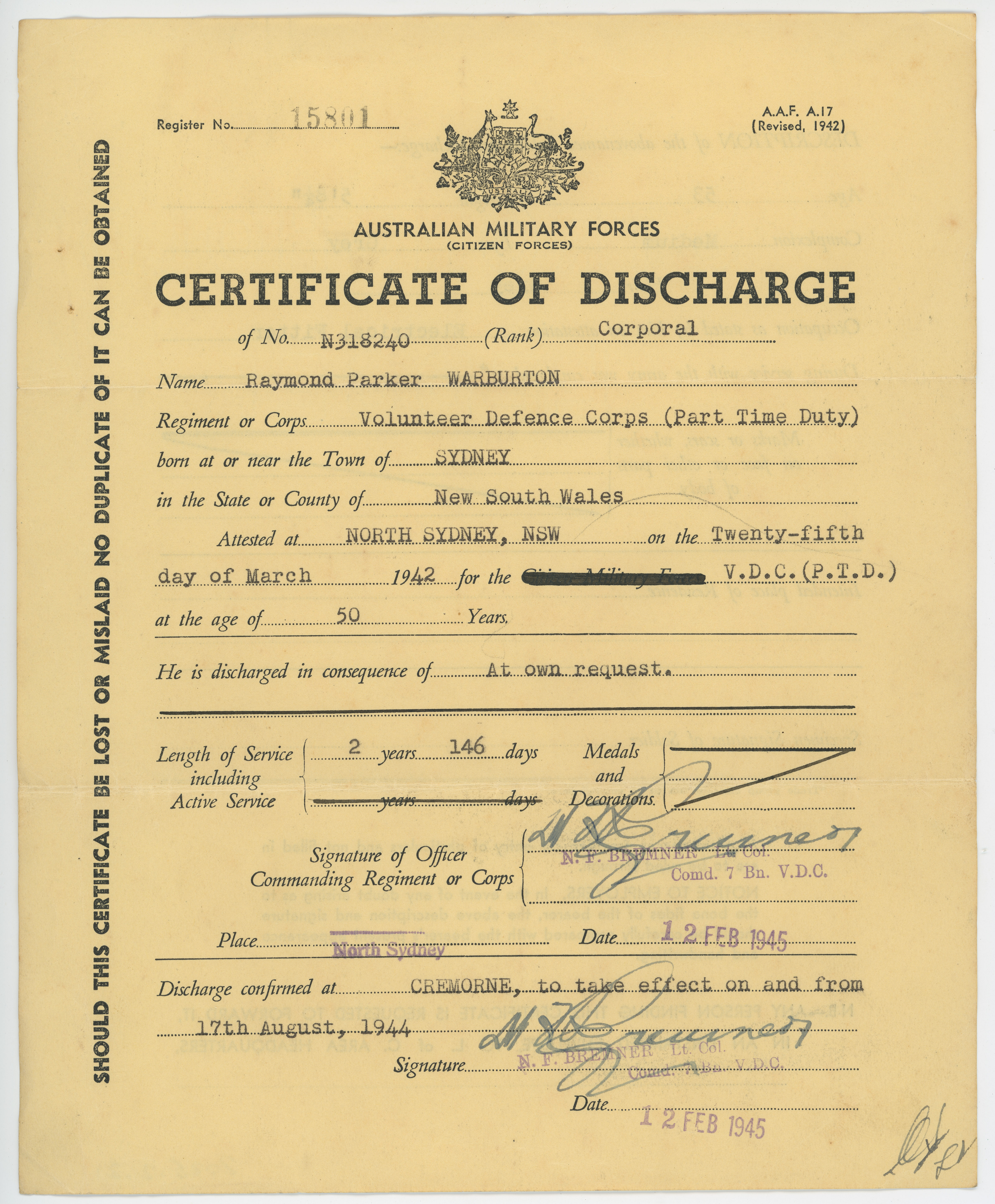 On top "Register No. 15801 / A.A.F. A.17 / (Revised, 1942) / AUSTRALIAN MILITARY FORCES / (CITIZEN FORCES) / CERTIFICATE OF DISCHARGE / of No. N318240 (Rank) Corporal / Name Raymond Parker WARBURTON / Regiment or Corps Volunteer Defence Corps (Part Time Duty) / born at or near the Town of SYDNET / in the State or Country of New South Wales / Attested at NORTH SYDNEY, NSW on the Twenty-fifth / day of March 1942 for V.D.C. (P.T.D.) / at the age of 50 Years. / He is discharged in consequence of At own request." at top left corner with Australian Coat of Arms top centre. Printed in bold lettering along left side edge, “SHOULD THIS CERTIFICATE BE LOST OR MISLAID NO DUPLICATE OF IT CAN BE OBTAINED”.