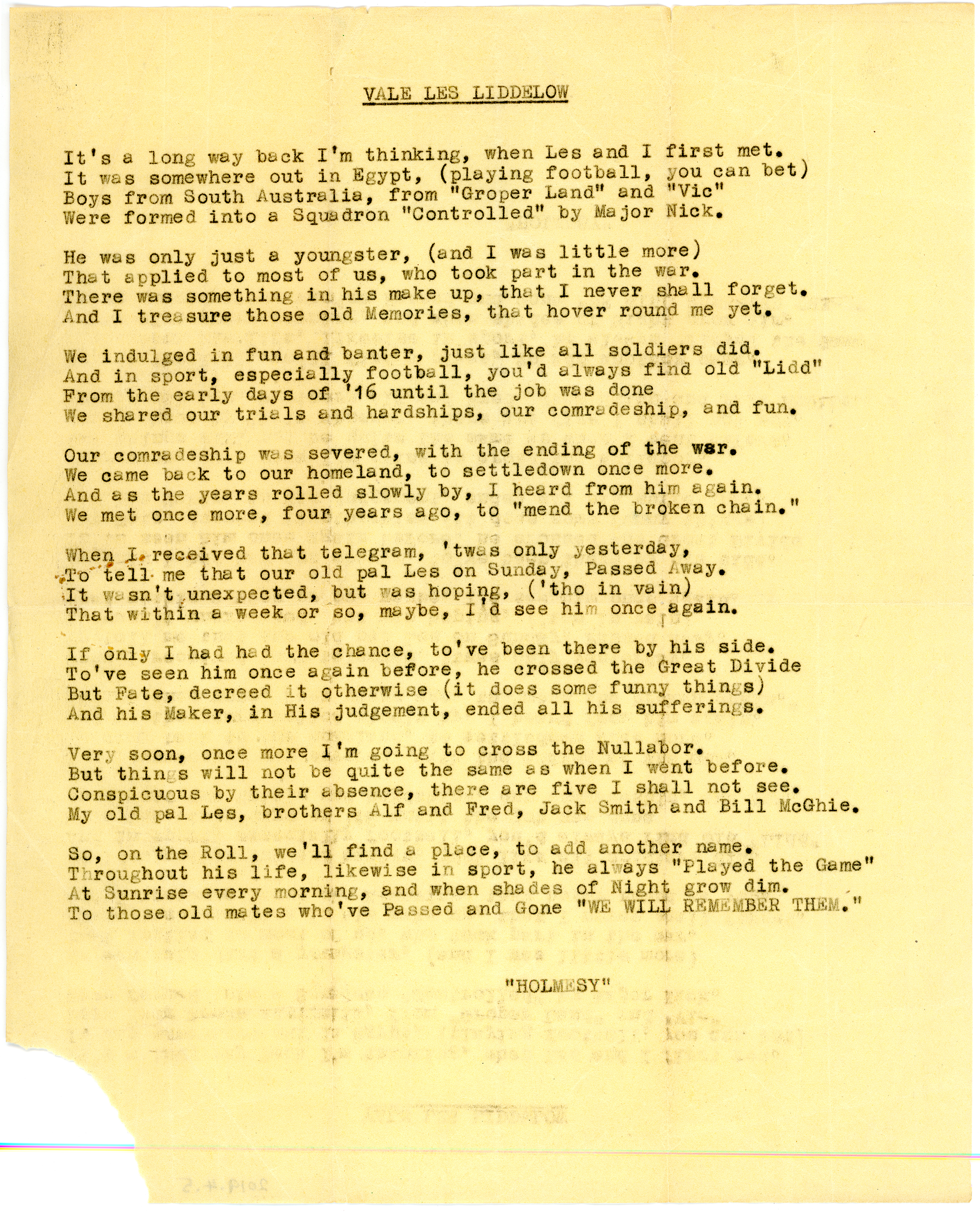 “VALE LES LIDDELOW / It’s a long way back I’m thinking, when Les and I first met. / It was somewhere out in Egypt, (playing football, you can bet) / Boys from South Australia, from “Groper Land” and “Vic” / Were formed into a Squadron “Controlled” by Major Mick. / He was only just a youngster, (“and I was little more) / That applied to most of us, who took part in the war / There was something in his make up, that I never shall forget. / And I treasure those old Memories, that hover round me yet. / We indulged in fun and banter, just like all soldiers did. / And I sport, especially football, you’d always find old “Lidd” / From the early days of ’16 until the job was done / We shared our trials and hardships, our comradeship, and fun. / Our comradeship was severed, with the ending of the war. / We came back to our homeland, to settledown once more. / And as the years rolled slowly by, I heard from him again. / We met once more, four years ago, to “men the broken chain.” / When U received the telegram, ‘twas only yesterday, / To tell me that our old pal Les on Sunday, Passed Away. / It wasn’t unexpected, but was hoping, (‘tho in vain) / That within a week or so, maybe, I’d see him once again. / If only I had had the chance, to’ve been there by his side. / To’ve seen him once again before, he crossed the Great Divide / But Fate, decreed it otherwise (it does some funny things) / And his Make, in His judgement, ended all his sufferings. / Very soon, once more I’m going to cross the Nullabor. / But things will not be quite the same as when I went before. / Conspicuous by their absence, there are five I shall not see. / My old pal Les, brothers Alf and Fred, Jack Moth and Bill McGhie. / So, on the Roll, we’ll find a place, to add another name. / Throughout his life, likewise in sport, he always “Played the Game” / At Sunrise every morning, and when shades of Night grow dim. / To those old mate who’ve passed and Gone “WE WILL REMEMBER THEM.” / “HOLMESY””