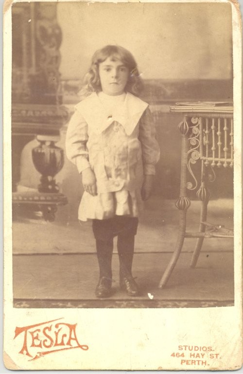 Print of sepia studio portrait of Reg Cargeeg as a child. He is wearing a long-sleeved, pleated tunic with large collar, over knee-length dark pants, with dark stockings and shoes. His curly hair is shoulder length. He is posed with an array of studio props including mat, cane and wicker table, urn, pillar and cyclorama. Lower left, in red, is [TESLA] and on the right [STUDIOS./ 464 HAY ST./PERTH.]