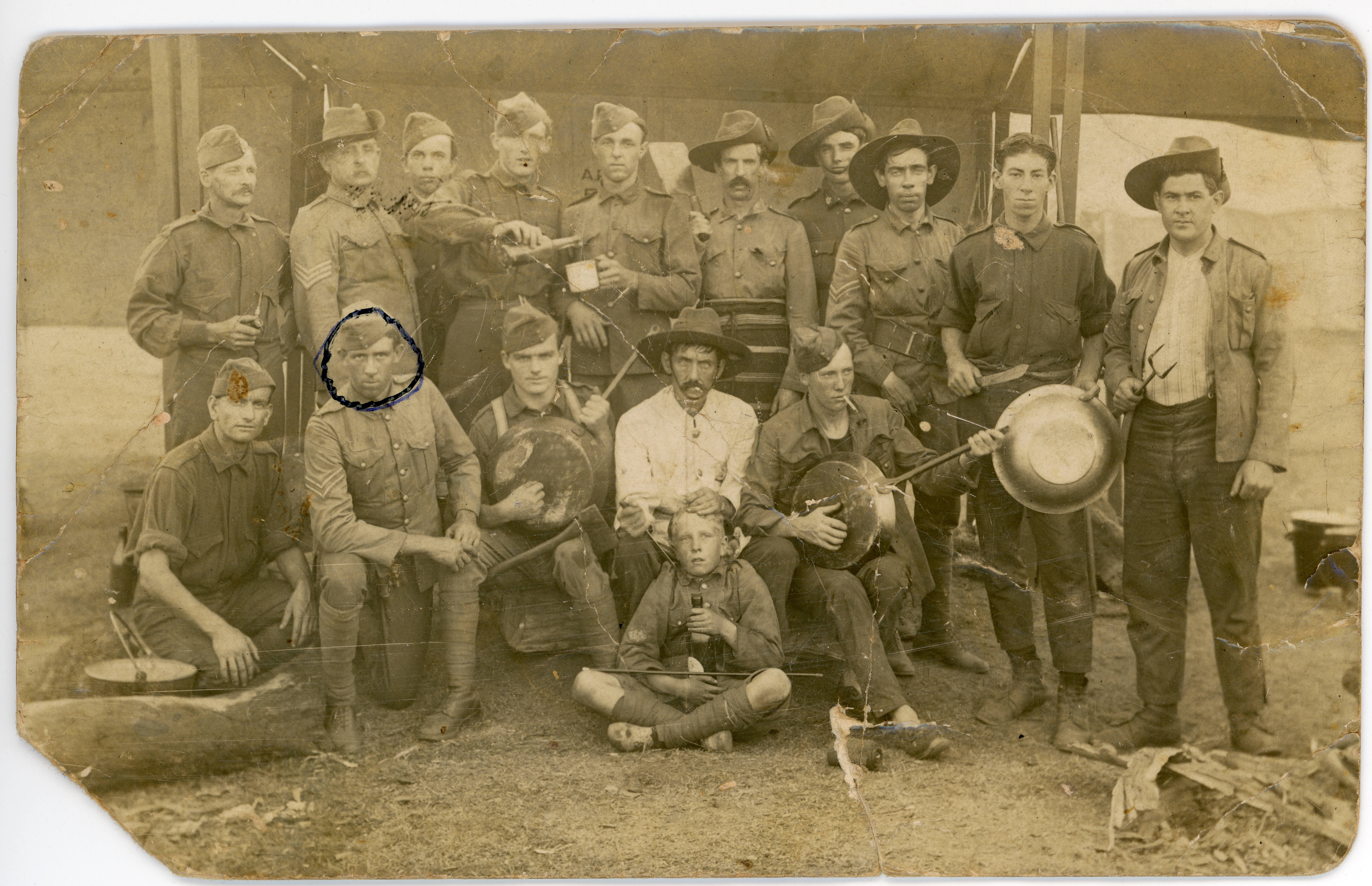 c. 1912Black and white photograph shows a group of 15 soldiers, in uniform and a young boy, holding a bottle seated middle at front of group. A few men are holding metal cookware as if playing a musical instrument and 2 soldiers standing centre are pouring a drink. The soldier standing next right is carrying a meat clever and wearing a butchers apron. Kneeling in front, second from left is Eric BANNISTER, (head circled in blue ink). As inscribed on the rear, the group are at the Liverpool Military Camp in N.S.W. and photograph is dated 1912.