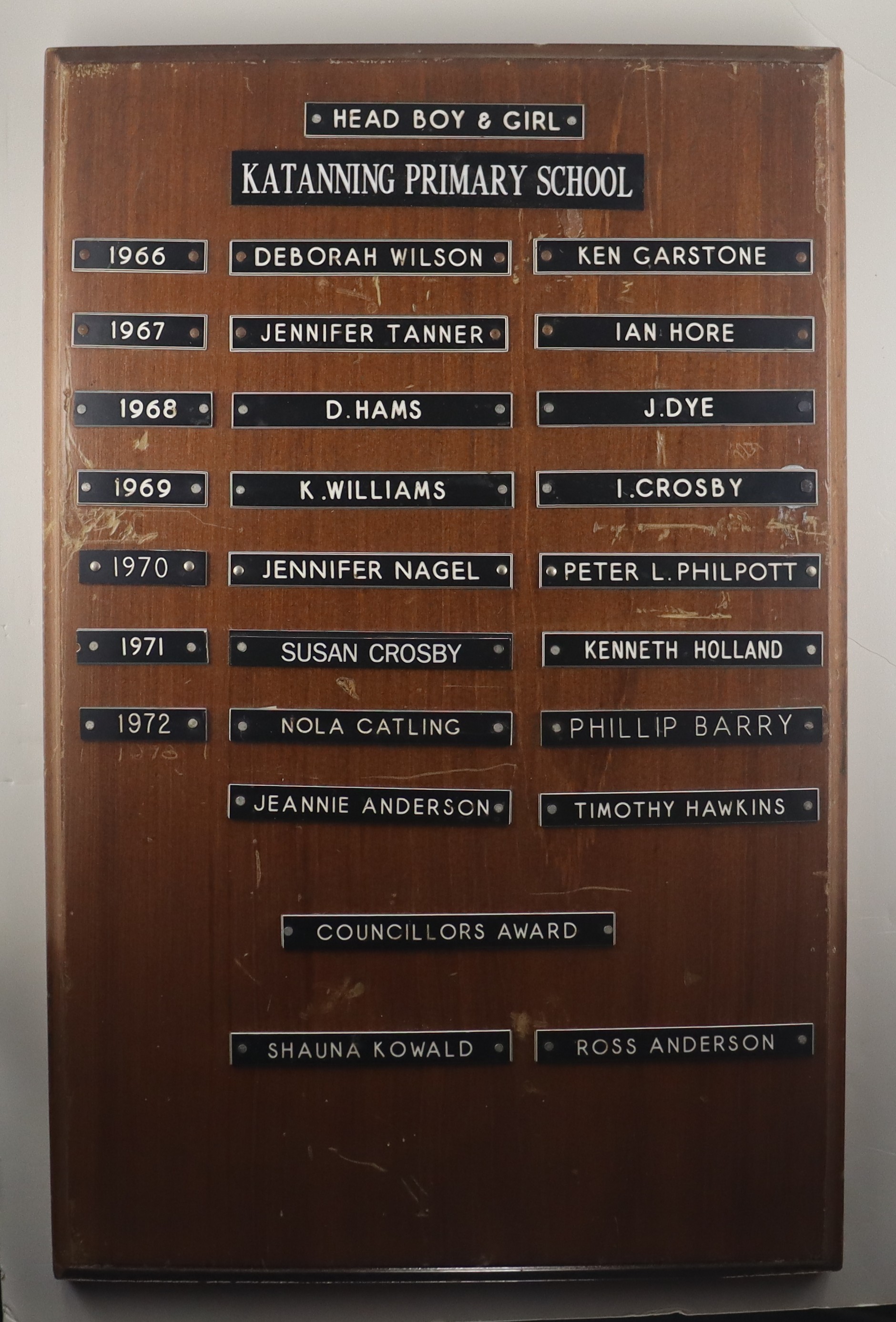 The board shows the Head Boy and Girl for the Katanning Primary School for the years 1966 to 1972.