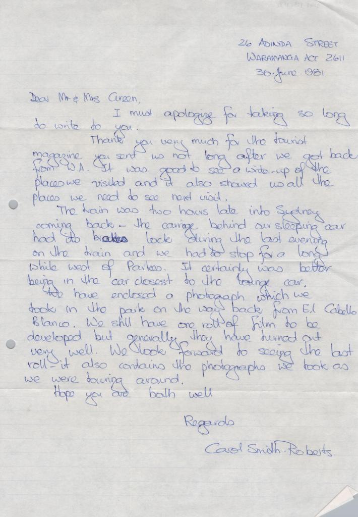 I must apologize for taking so long to write to you. Thank you very much for the tourist magazine you sent us not long after we got back from W.A. It was good to see a write-up of the places we visited and it also showed us all the places we need to see next visit.
