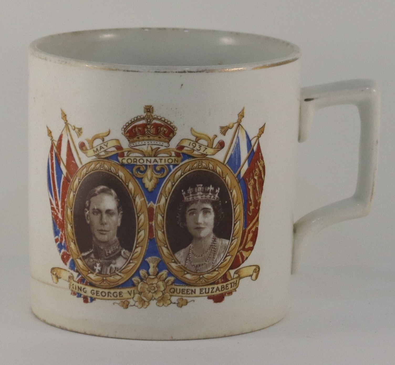 1937A white ceramic cup with two oval pictures, one of King George V and the other Queen Elizabeth in sepia. On either side of the oval pictures are the flags of England in gold red and blue, and separating the two pictures is a gold and red crown. Underneath the two pictures is a gold ribbon scroll. On the other side of the cup is a blue drawing of leaves intertwined around a blue ribbon scroll. There is a gold trim around the rim of the cup and handle.