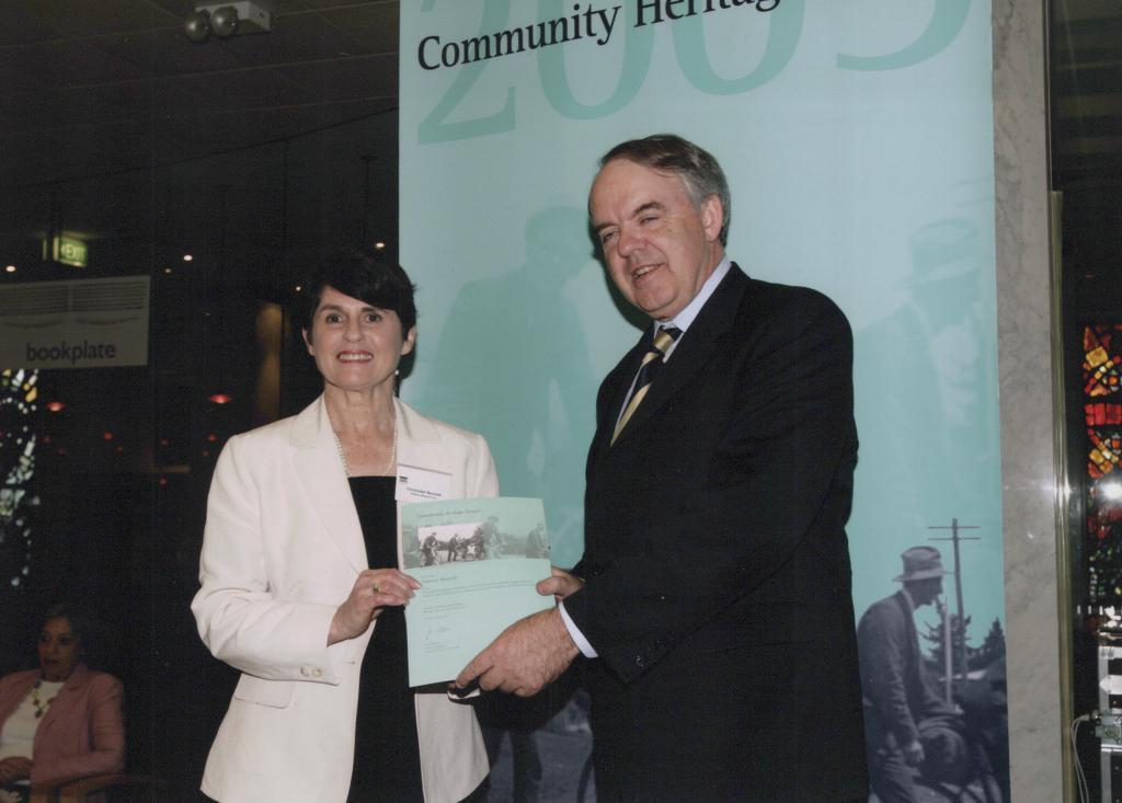 2005Coloured photograph of a lady (Christobel Bennett) and a man (Senator Rod Kemp) posing for an award being presented to Christobel. Image was taken inside, possibly in a church (due to the stained glass windows in the background). The subjects of the photo are posing in front of a large pale green backdrop that has 'Community Heritage 2005' written on the top, and an image of a man playing the saxaphone in the bottom half of the backdrop. A lady in a pink cardigan can be seen in the bottom left of the image.