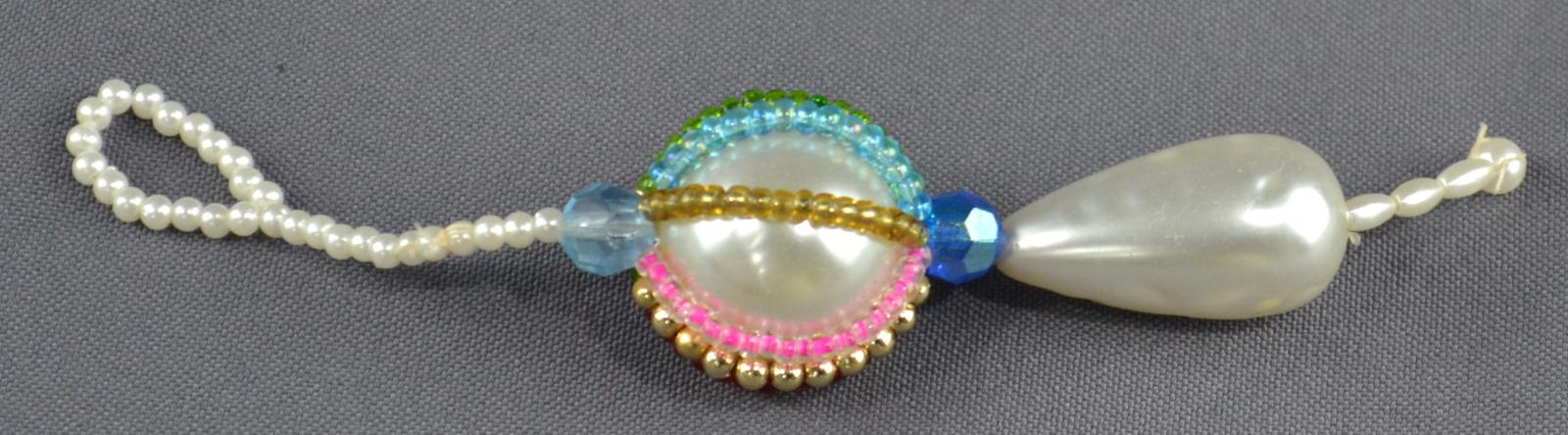 This Christmas decoration pearl and orb was made by Evelyn Mills during a craft session held by the Kelmscott Hobby Club at the St Mary's Church Hall in Kelmscott. The item was displayed by Evelyn Mills at her home at 123 Railway Avenue Kelmscott.