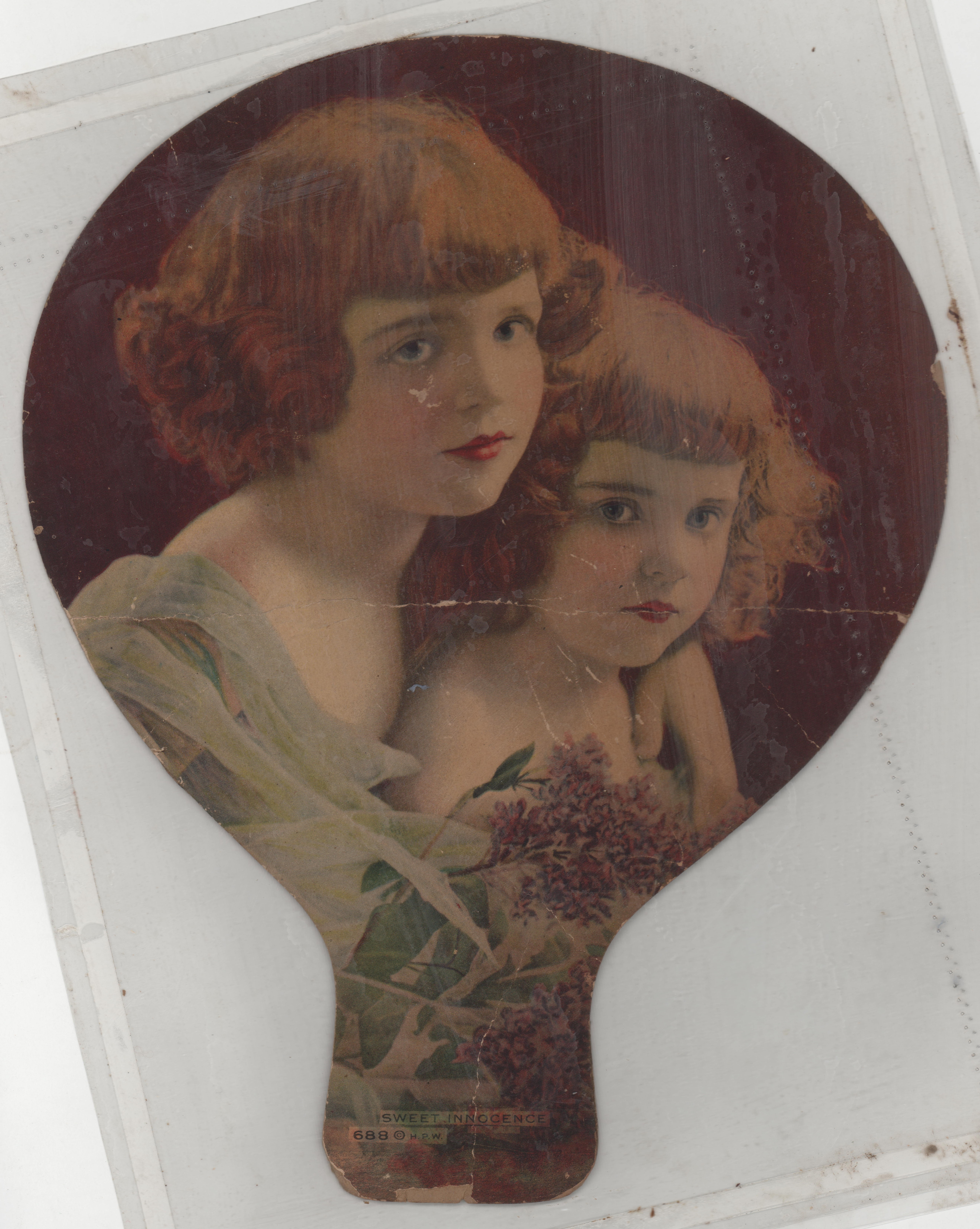 c. 1920A circular shaped fan with a short handle. On the front are the head and shoulders picture of two young girls and a posy of flowers in front of them.