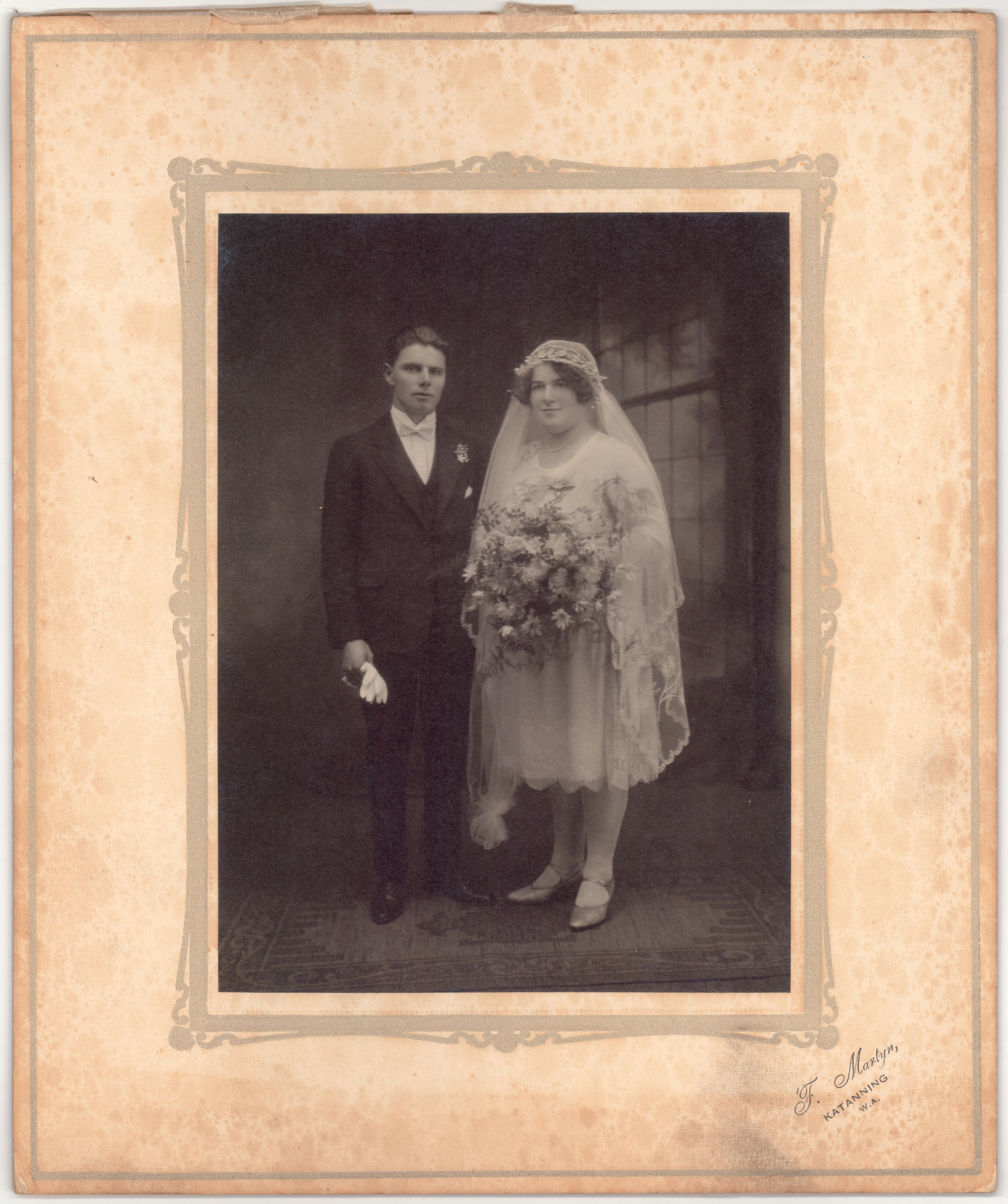 c. 1928A black and white photograph of a man dressed in a black formal suit and holding a pair of white gloves. He is the bridegroom and he is standing next to his bride who is wearing a white short dress and lace head piece with a train and holding a bouquet of flowers.