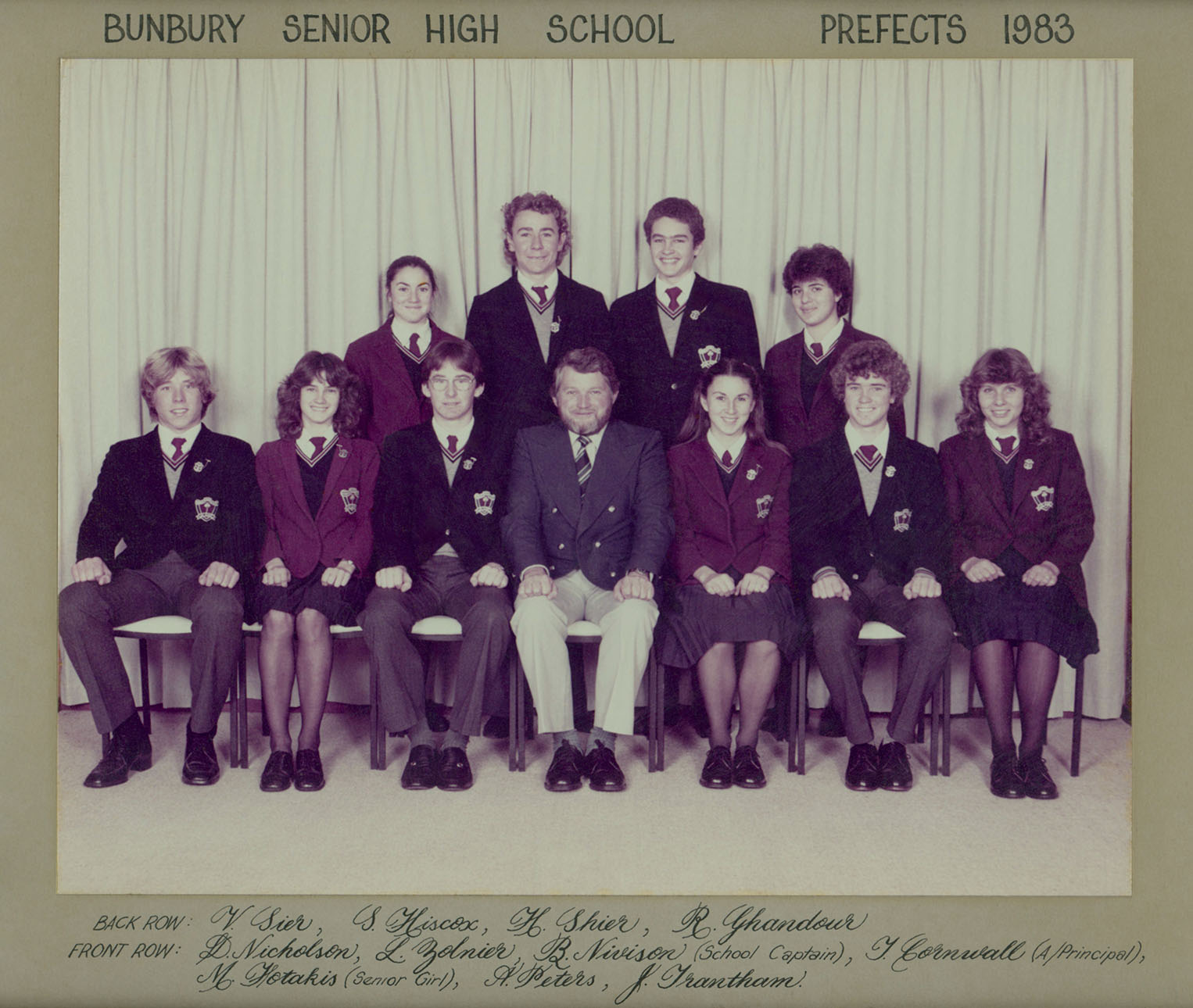 1983Group photograph of the 1983 Bunbury Senior High School Prefects with acting principal Tom Cornwall.