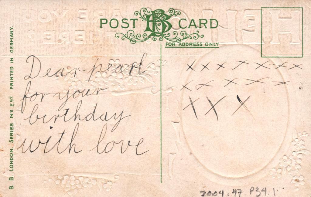 Reverse: Written in black pen 'Dear Pearl for your birthday with love xxxxxx…'