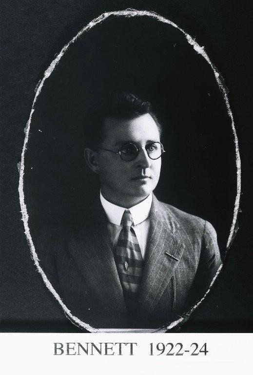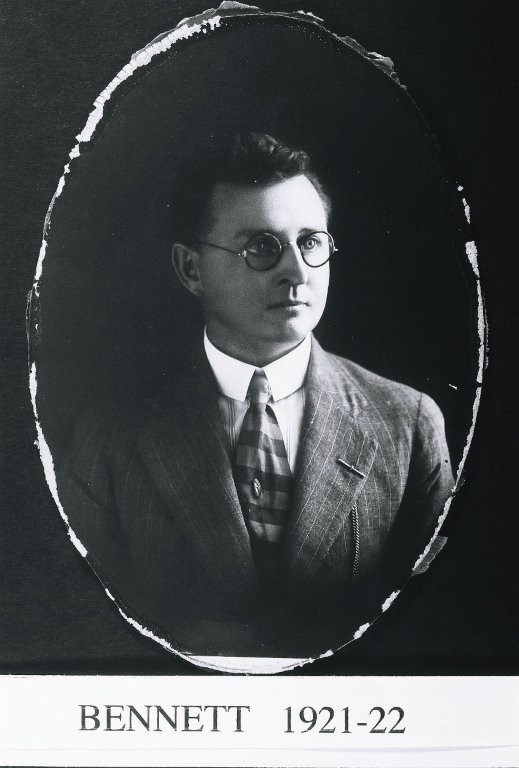 B/W prints. (a) Bust portrait of a young man with dark wavy hair and round spectacles. He is wearing a striped jacket with a watch chain through the top buttonhole, a striped shirt with a white stiff collar and a horizontally striped soft tie with stickpin. Printed beneath [BENNETT 1921-22]. (b) Same portrait [BENNETT 1922 -24].