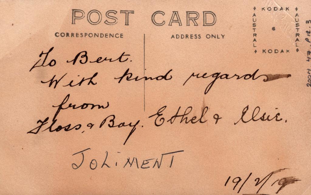 Reverse: Written in black pen 'To Bert. With kind regards from Floss & Bay. Ethel & Elsie. 19/2/19' and 'JOLIMENT' (Jolimont)