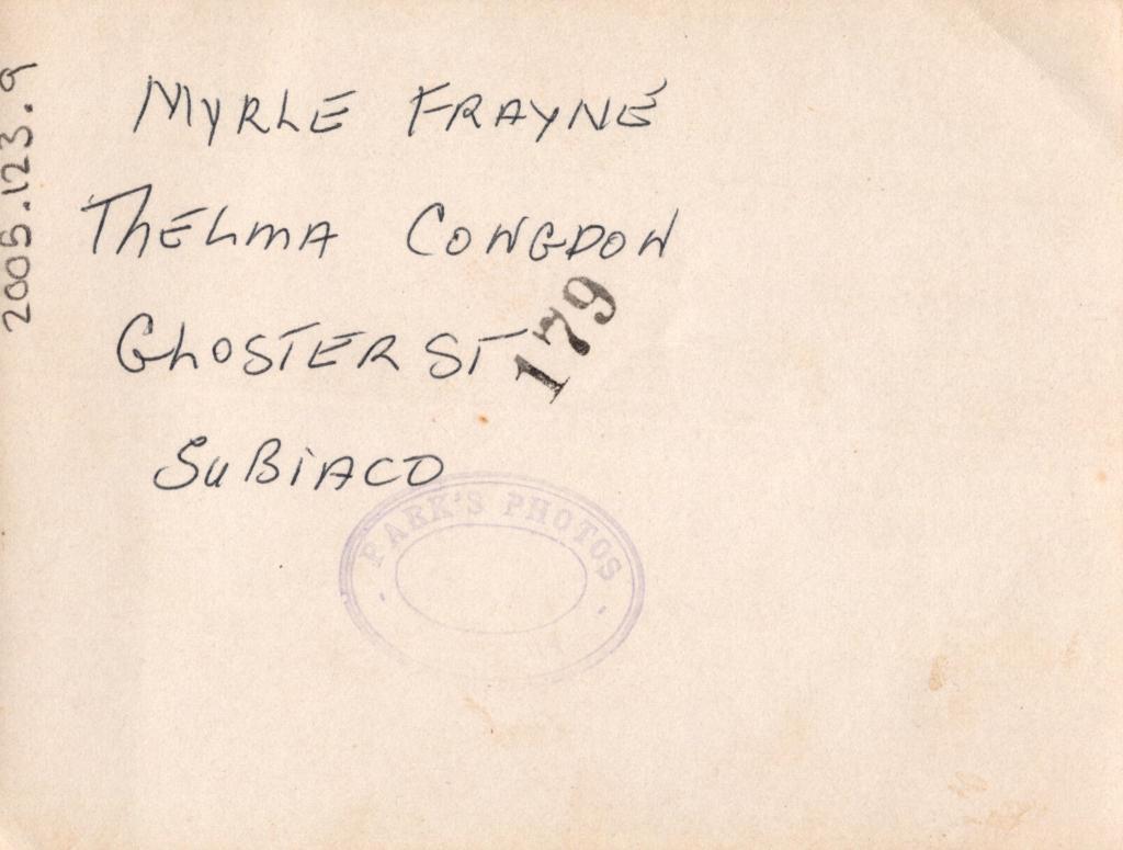 Reverse: Handwritten in black pen 'MYRLE FRAYNE', 'THELMA CONGDON', 'GLOSTER ST SUBIACO'. Stamped on the back with a purple oval stamp reading 'PARK'S PHOTO PERTH' and a number '179' in black.