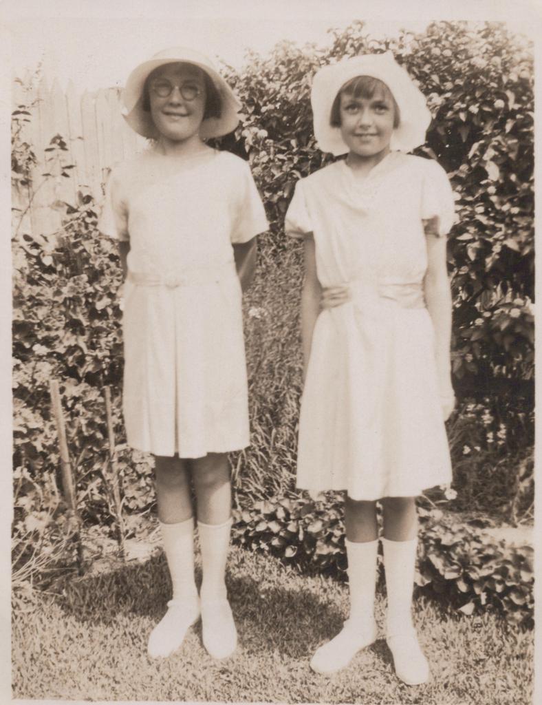 c. 1930Image: A photograph of Myrle Frayne (left) and Thelma Congdon (right) as young girls, standing on grass in front of some vegetation. They are both wearing a short sleeved white dress coming down to their knees, with white closed shoes and long white socks. Myrle is wearing a pair of glasses with a round, dark frame. What appears to be a wooden fence is behind the vegetation behind them.