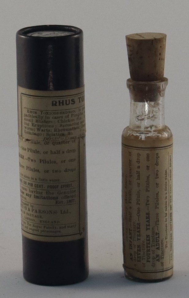 The white label on the container has black typed lettering "RHUS TOX." and underneath is "RHUS TOXICODENDRON, is prescribed homoeopathically in case of Pimples; Ringworm; Warts; rheumatism; Deep-seated Sprains; Lumbago; Sciatica." DOSE - Every three hours. AN INFANT.-Half a Pilule, or quarter of drop of Tincture. SEVEN YEARS.- One Pilule, or half a drop of Tincture. FOURTEEN YEARS.- Two Pilule, or one drop of Tincture. AN ADULT.- Two Pilule, or two drops of Tincture. The Tincture to be taken in a little water. THE TINCTURE CONTAINS 100 PER CENT . PROOF SPIRIT. CAUTION. - Insist on having the Genuine Medicines and refuse any imitations offered from interested motives. Est 1867. Prepared by Phosferine (ASHTON & PARSONS) Ltd., LA BELLE SAUVAGE. LUDGATE HILL, LONDON, ENGLAND. Honoured by our commands from the Royal Family , and many other distinguished and august personages.".