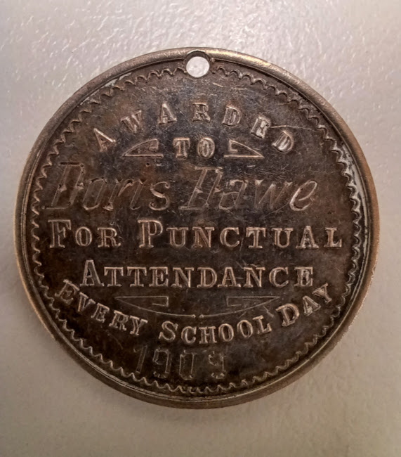 Front of coin: "Awarded to Doris Dawe for punctual attendance every day 1909"
