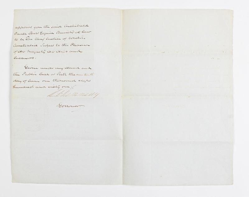 1861Handwritten warrant by the Governor of Western Australia, Arthur Edward Kennedy, appointing Archibald Paull Burt as Chief Justice of Western Australia. Dated 19 June 1861.