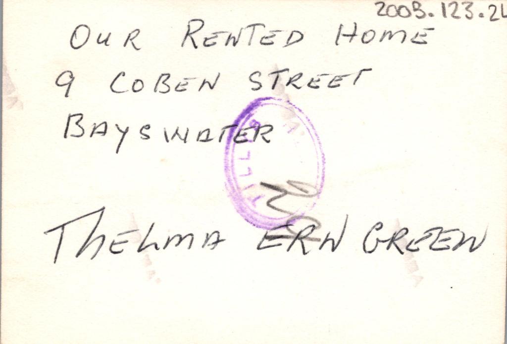 Reverse: Handwritten in black pen is 'OUR RENTED HOME', '9 COBEN STREET', 'BAYSWATER', 'THELMA ERN GREEN'. There is a purple stamp 'PARK'S X PRESS PHOTOS PERTH' and a number written in pencil, '24'.