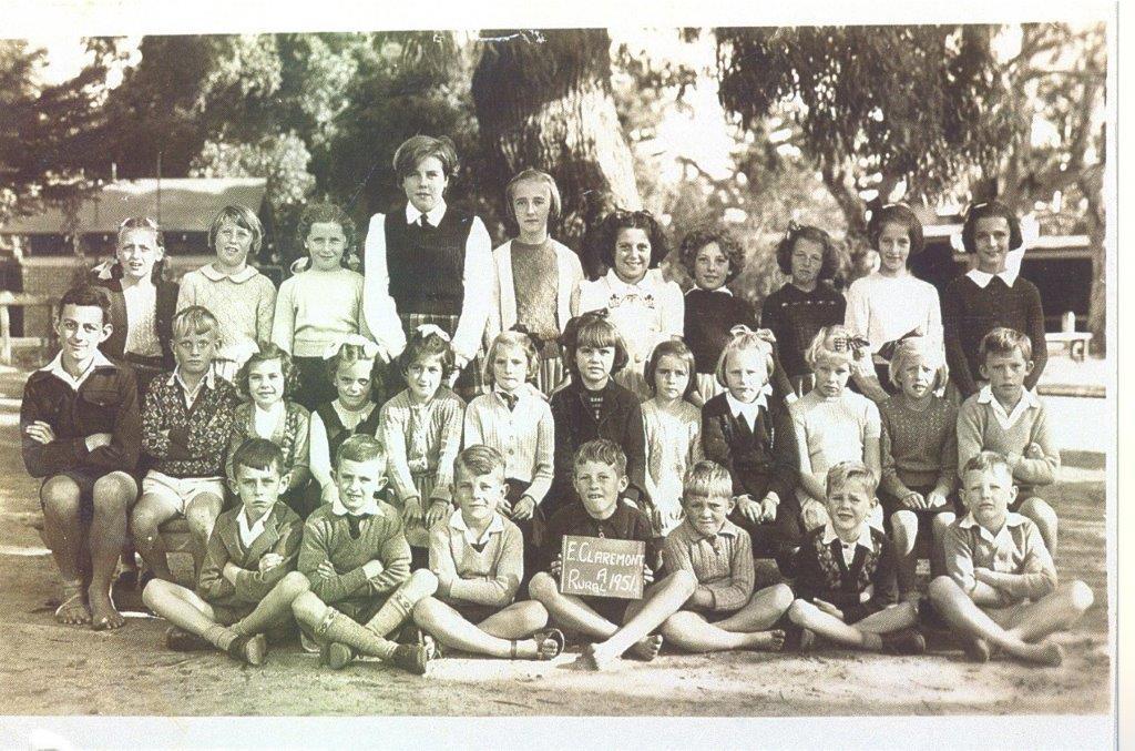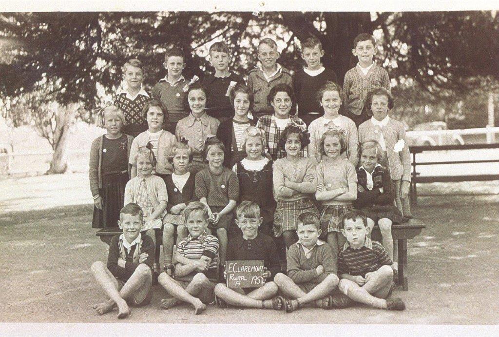 1950 - 1951B/W prints. (a) A group of 29 students of varying age arranged in three rows under trees in the school grounds. The boy in the centre of the front row is holding a sign [E.CLAREMONT/ RURAL A 1951]. (b) A group of 25 students of varying age arranged in three rows in the school grounds under trees. The boy in the centre of the front row is holding a board. [E.CLAREMONT/ RURAL A 1952]