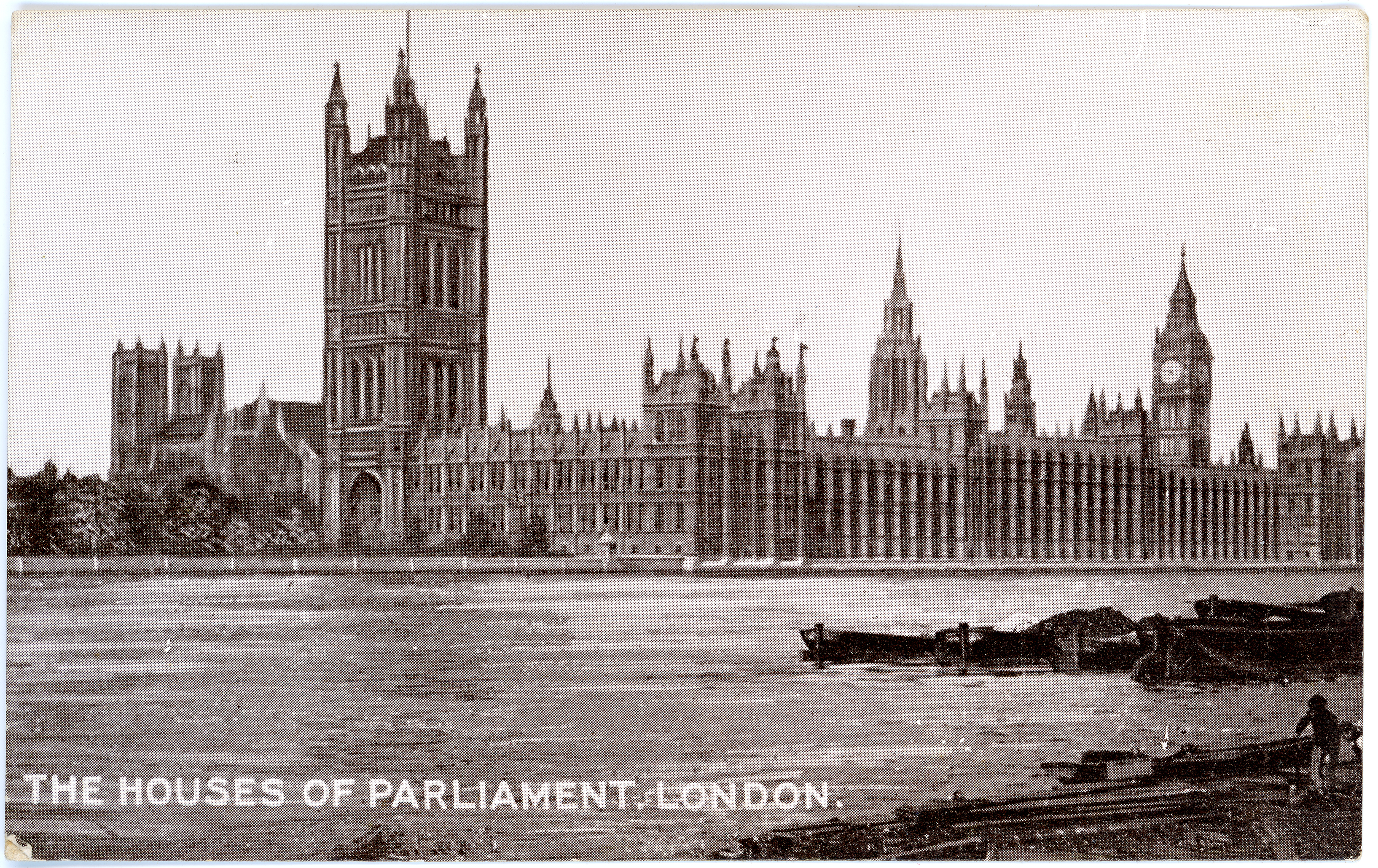 c. 1915Postcard showing a black and white image of The Houses of Parliament, London with the Thames in the foreground. On the back are the usual postcard markings.