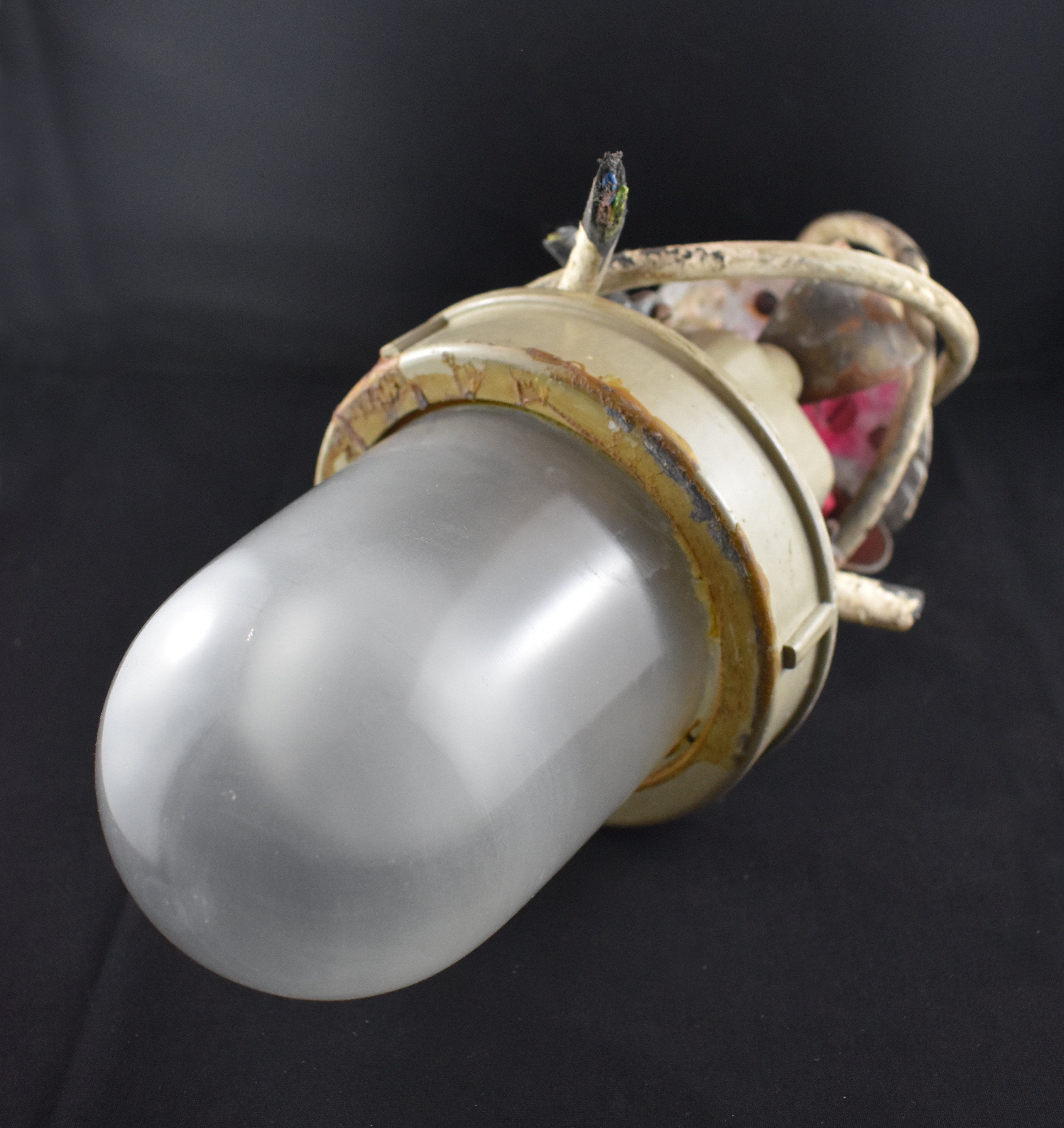 c. 1965Frosted glass dome cover housing electrical light globe set within a plastic fixture and attached to a metal mount with pink spray paint on. Has a length of electrical cord attached.