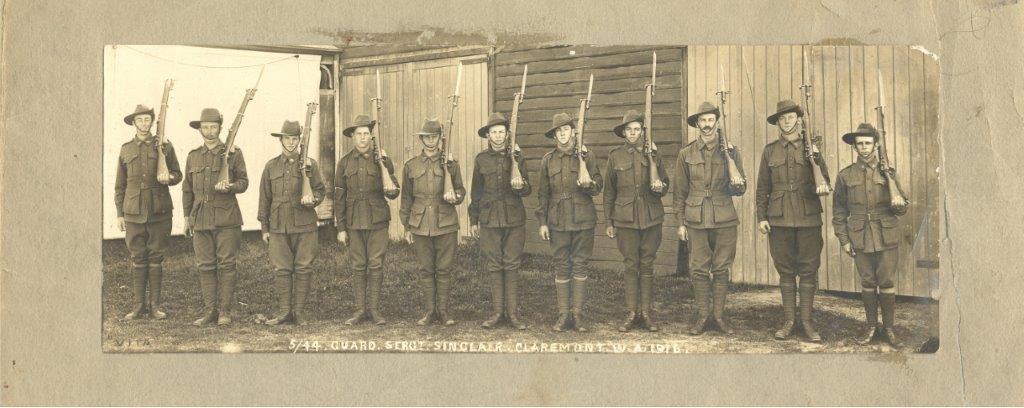 1916B/W Print. Eleven men standing in a line facing the camera. They are wearing WWI uniform of tunics, trousers, leggings, boots and slouch hats, and are shouldering rifles with fixed bayonets. Behind them is a large weatherboard building with two sets of large hinged doors; to the left is a large white canvas blind with pulleys. In white under the image is [5/44. GUARD. SERGT. SINCLAIR. CLAREMONT. W.A. 1916.]The image has been glued into a light, grey card folder.