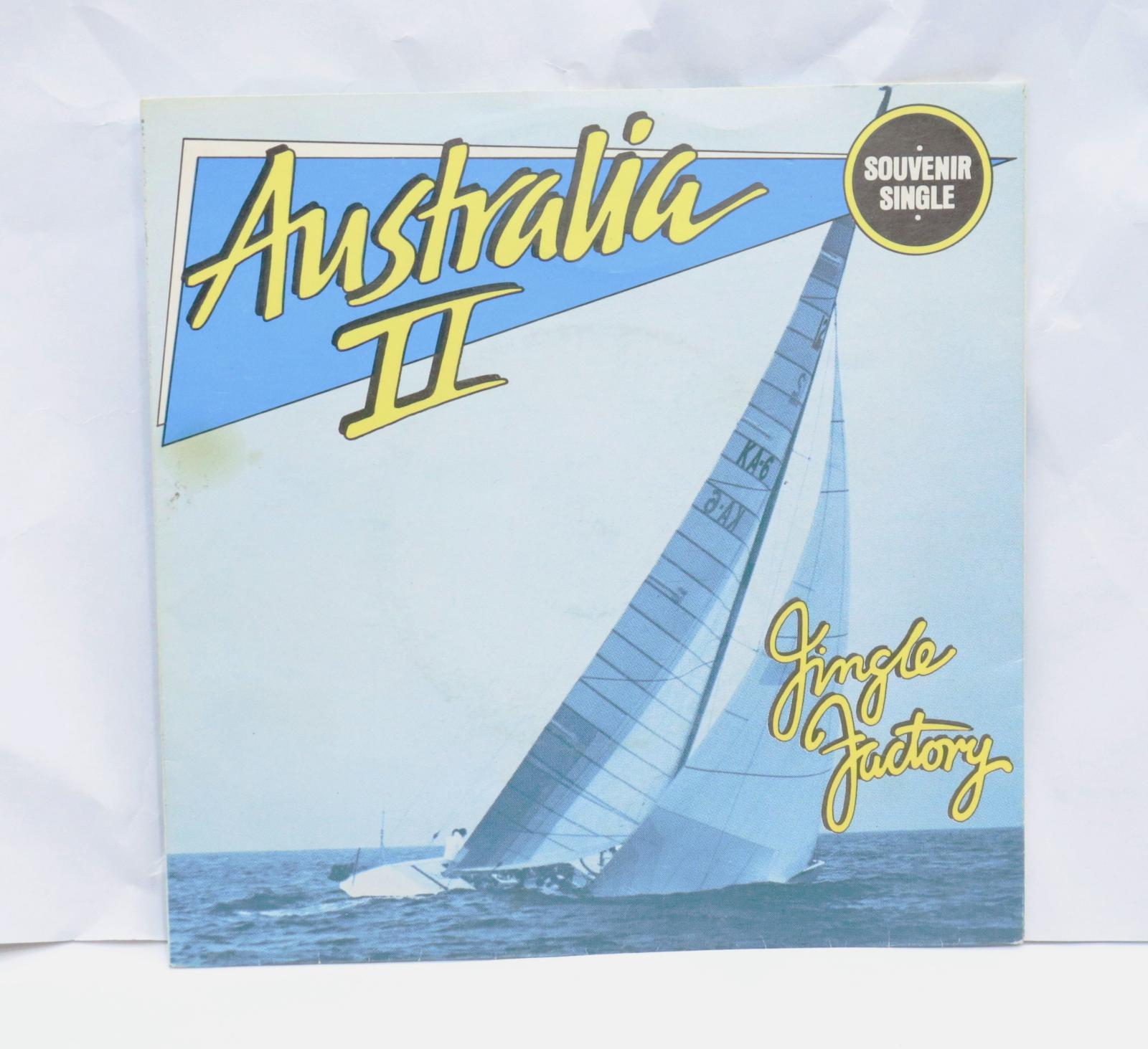 1983A card cover for a 45 RPM vinyl single record. The cover has a photograph of the yacht Australia II on the front in a blue hued print. At the top of the front is [Australia II] in yellow ink, with the words [SOUVENIR SINGLE] in white print on a black circle, with a yellow border, printed at the top right of the cover. Towards the bottom right of the square is the makers mark [Jingle Factory].