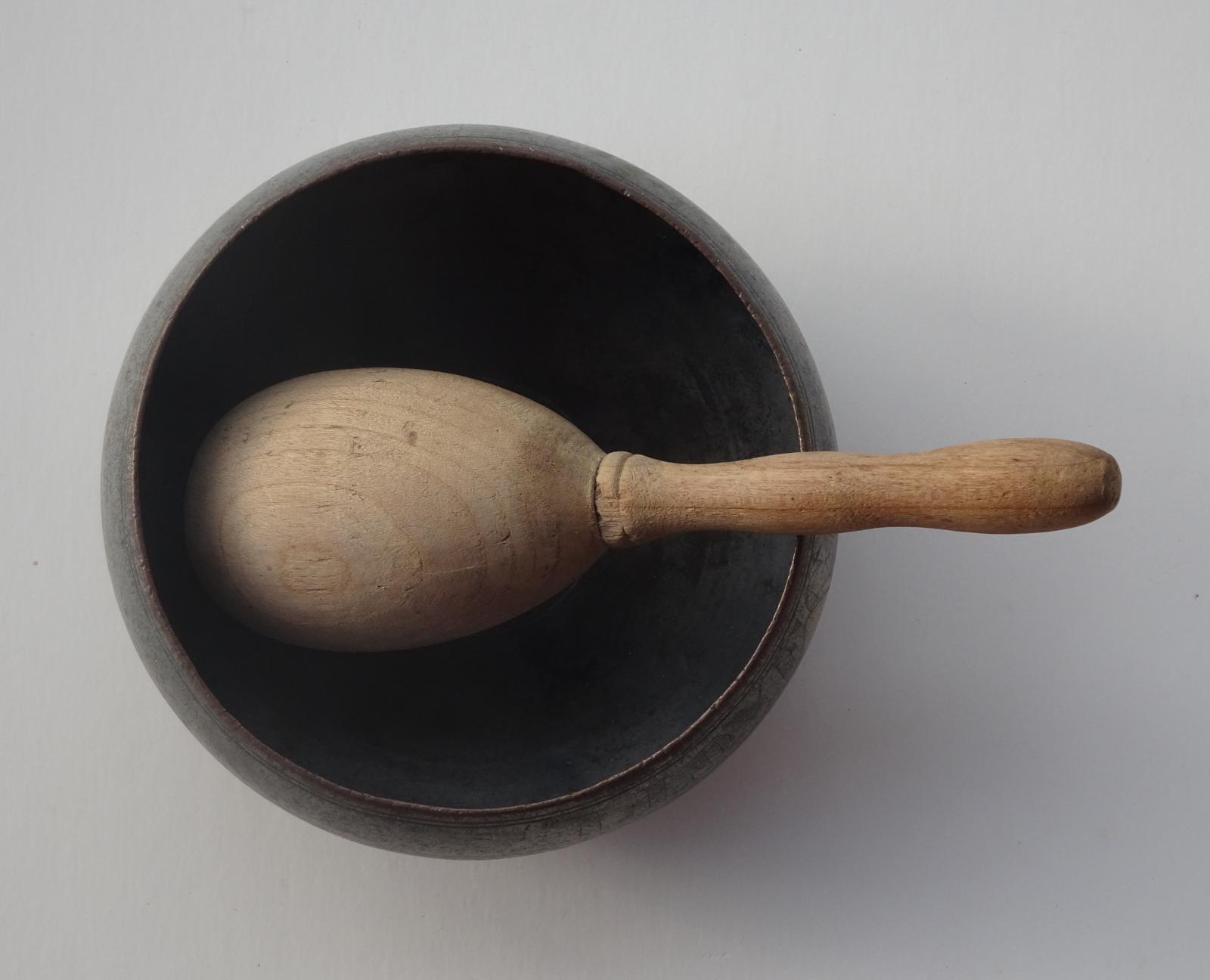 A steel bowl with an etching around the top rim is accompanied by a wooden pestle.