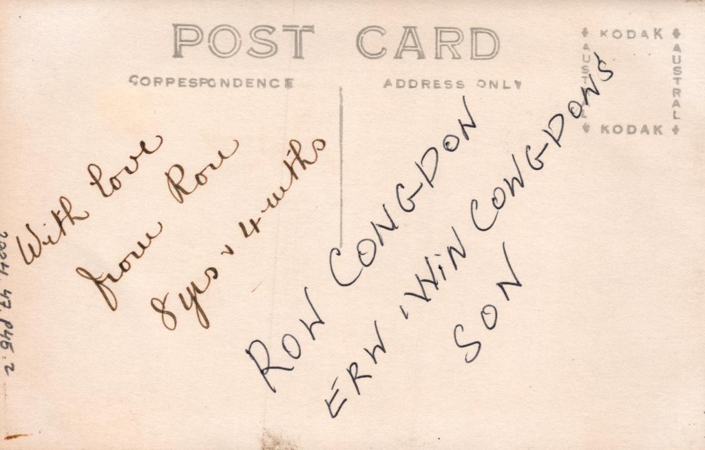 Reverse: Written in black pen 'With love from Ron 8 yrs & 4 months' and 'RON CONGDON ERN WIN CONGDON'S SON.
