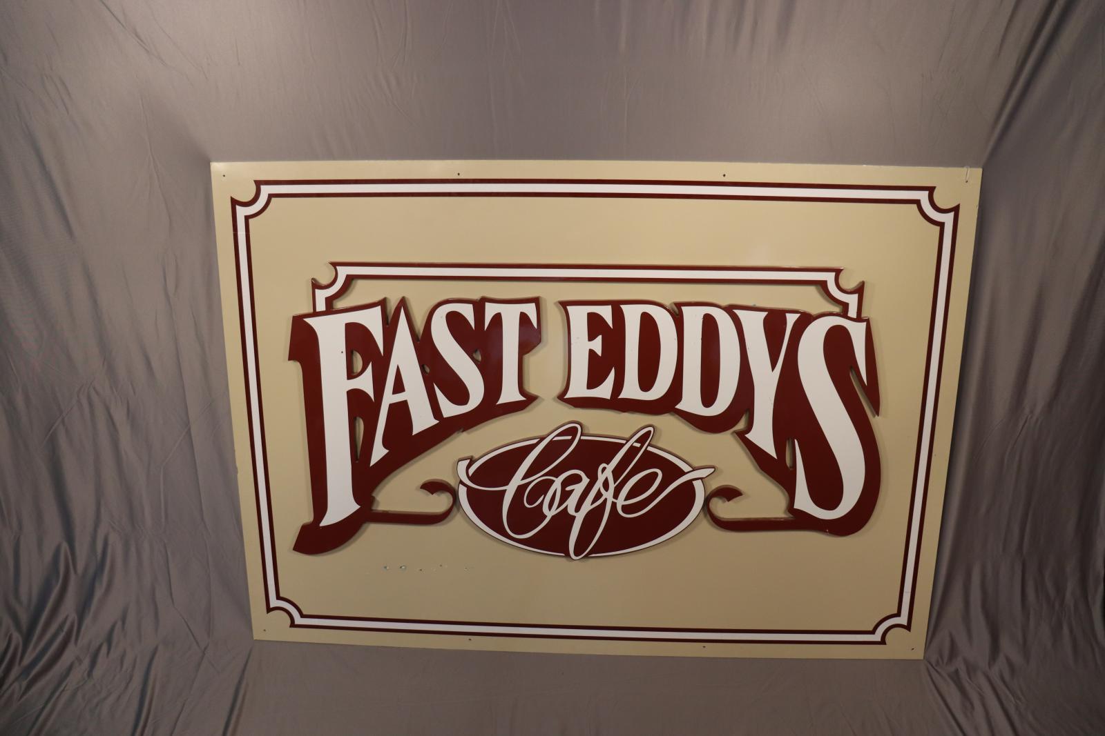 2008 - 2019Rectangle hard plastic sign. Front coloured tan with a maroon, white maroon border on the inside of the front edge. In middle is raised moulded text, maroon on the ourside edge and white on the inside [FAST EDDYS]. Under this is a maroon raised oval with a white boarder and in white written across it [Cafe]. The moulded text and oval are attached with brass screws.