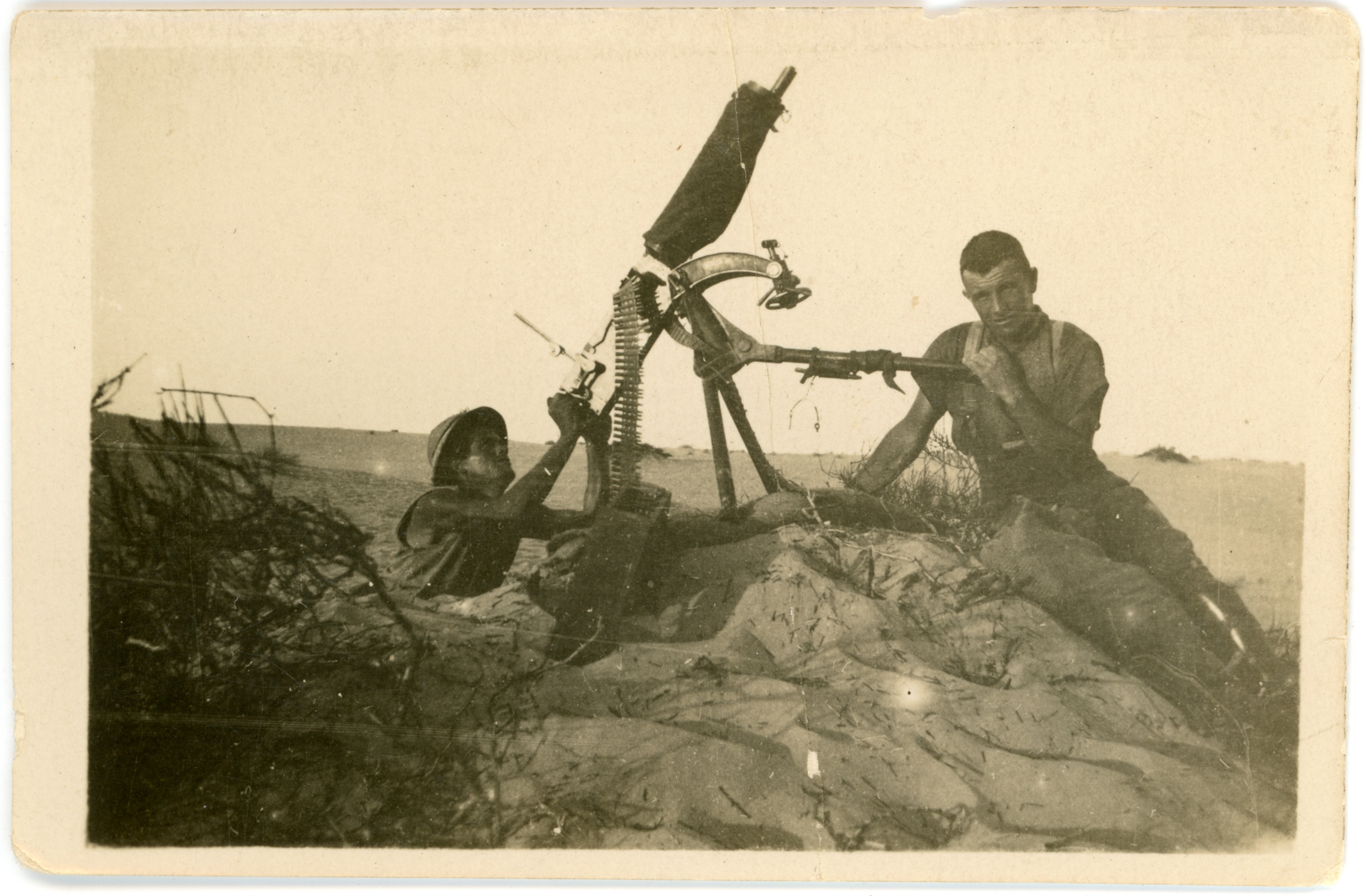 1916 - 1918A small black and white photograph showing two (2) unnamed soldiers sitting with a machine gun. One soldier is looking directly at the camera and appears to be holding one leg of a tripod. The other is looking up through the guns sight in the direction of the barrel which is pointed into the air. The gun is positioned on a sand dune and has the water jacket on the barrel. The elevation wheel is clearly visible, as is a belt of ammunition. There is a box sitting on the sand by the gun which likely contains extra supplies.