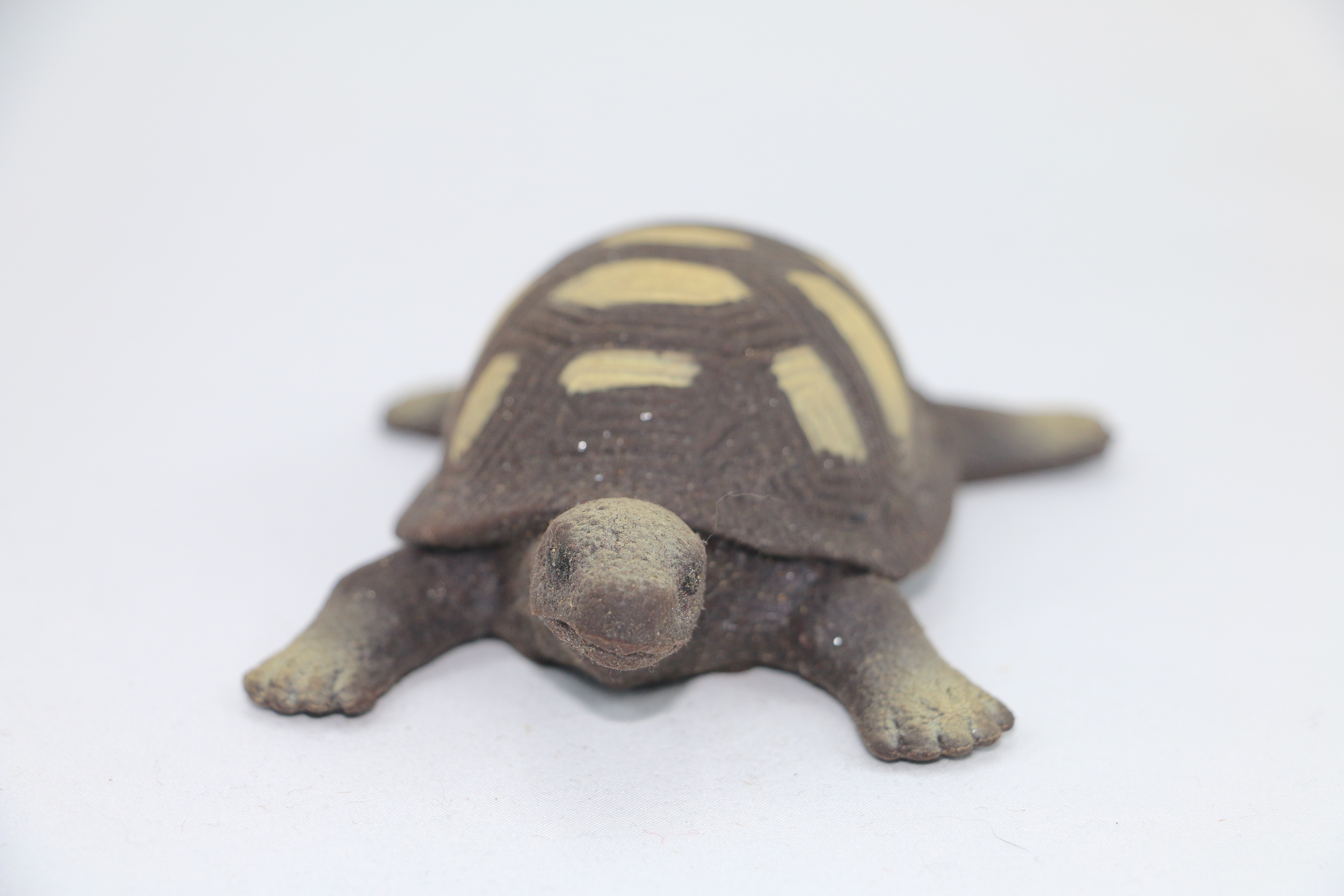 Silicone toy turtle, brown with lighter brown decorations along the shell.