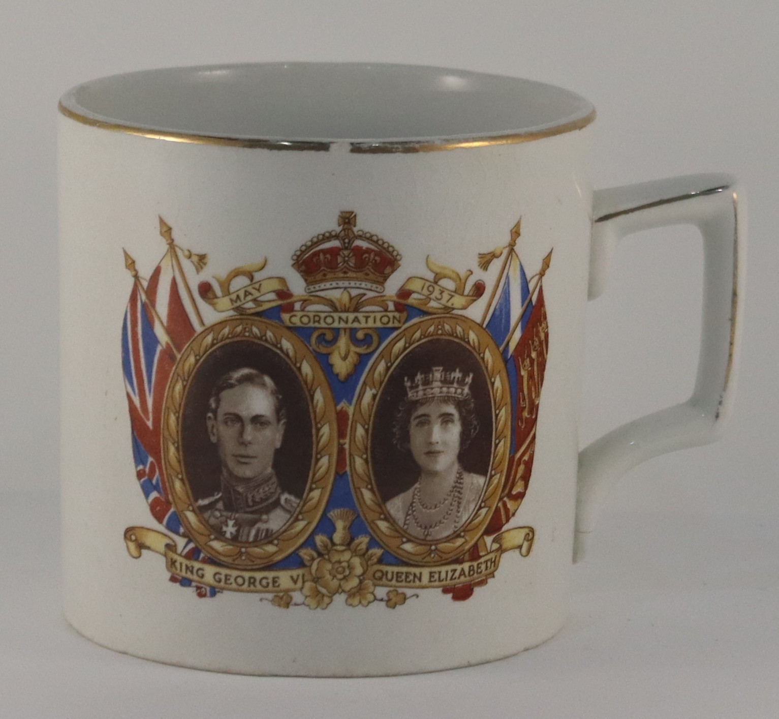 1937A white ceramic cup with two oval pictures, one of King George V and the other Queen Elizabeth in sepia. On either side of the oval pictures are the flags of England in gold red and blue, and separating the two pictures is a gold and red crown. Underneath the two pictures is a gold ribbon scroll. On the tother side of the cup is a blue drawing of leaves intertwined around a blue ribbon scroll. There is a gold trim around the rim of the cup and on the handle.