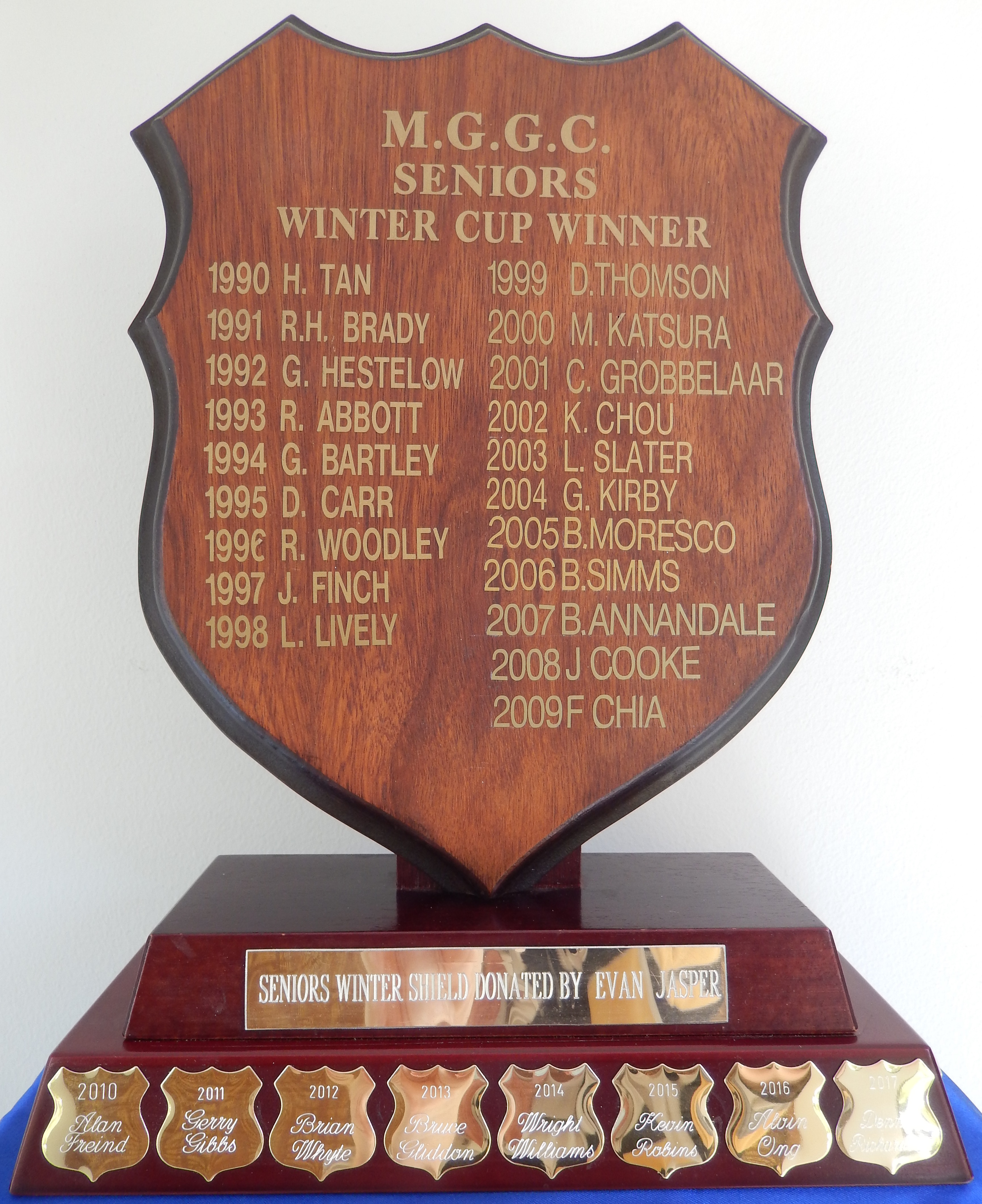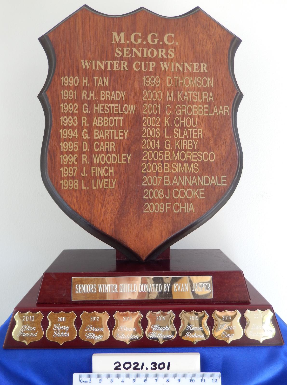 This was the original perpetual trophy used to recognise the winners of the Seniors' Winter Cup. The winners' names for the period 1990 - 2009 appear on gold shields attached to the base. These names, also listed below, have been transposed onto the current trophy. The current trophy is larger and more prestigious and also titled the Seniors' Winter Cup Trophy (see Item 2021.250).