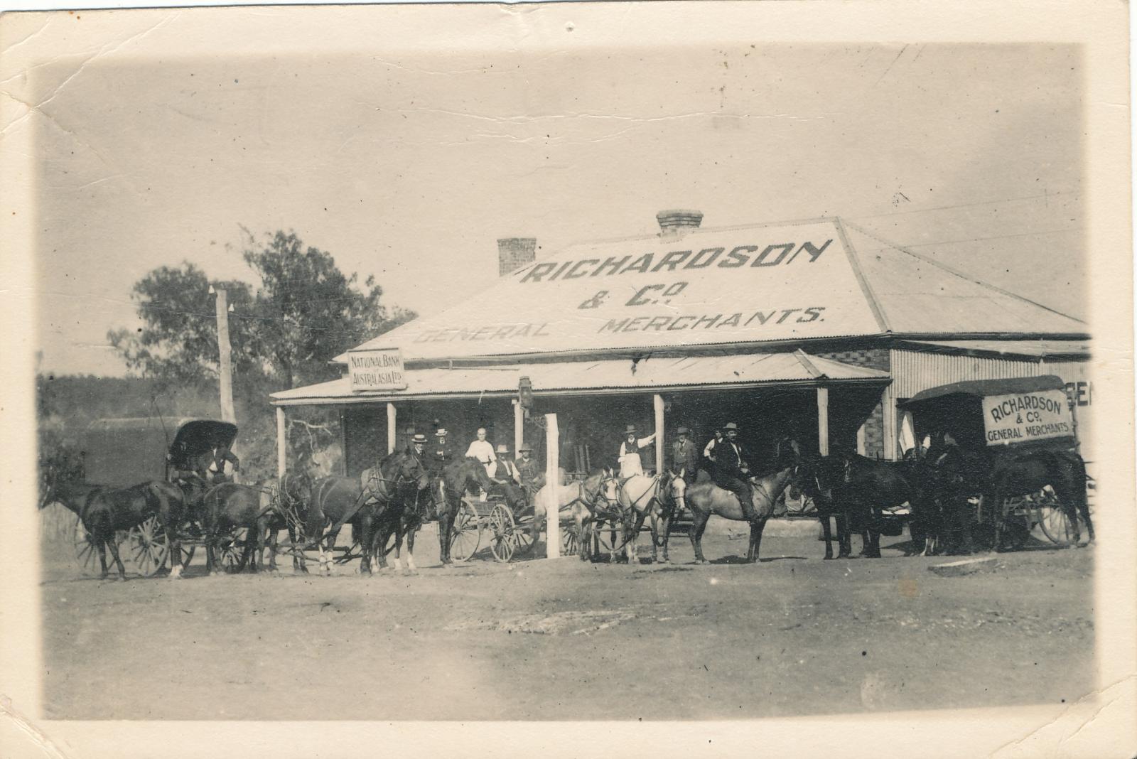 Richardson & Co (first store) Kojonup Store. Richardson & Co's store was opposite the Royal Hotel. On the right side of the photo note the covered horse drawn buggy with the store's name on the side. Photo is thought to be c1906. Lamp post with light brackets is featured the on verandah is Mr Frederick Watts. Man on horse possibly J.J. Treasure. There is a 'tif' image for this photo.