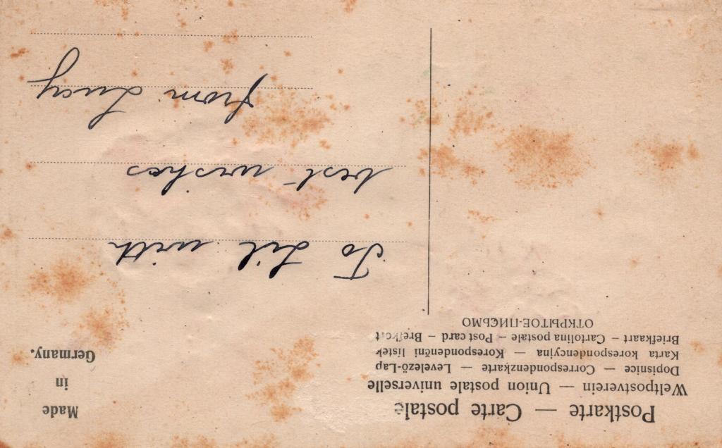 The reverse has the word postcard in many different languages on the top left corner. Made / in / Germany' is printed in the top right corner in english.