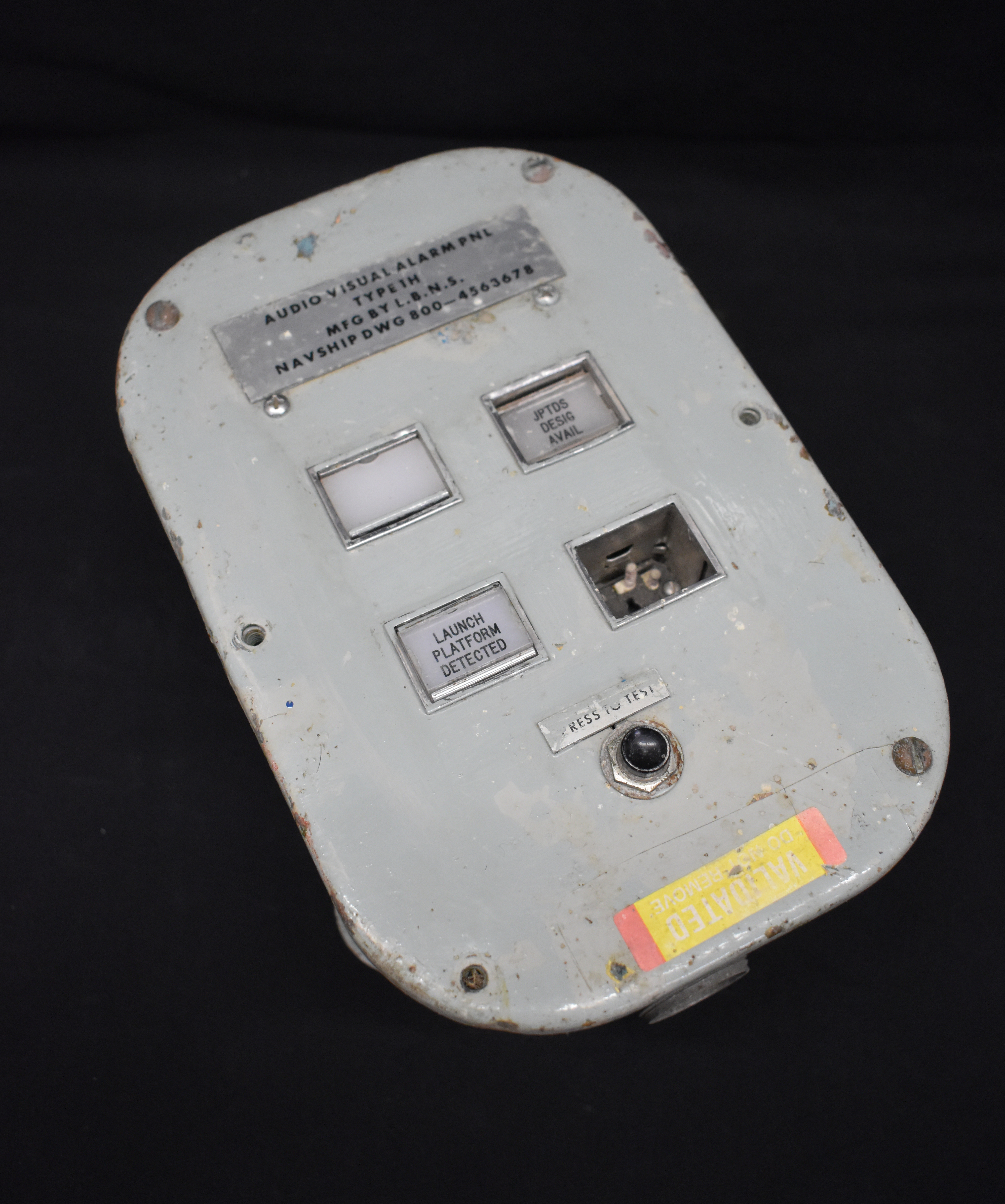 On front "AUDIO VISUAL ALARM PNL / TYPE 1H / MFG BY L.B.N.S. / NAVSHIP DWG 800-4563678" with "JPTDS . DESIG / AVAIL" and "LAUNCH / PLATFORM / DETECTED" on two (2) buttons. "PRESS TO TEST" on small metal plaque with "VALIDATED / DO NOT REMOVE" on yellow and red adhesive label on front.
