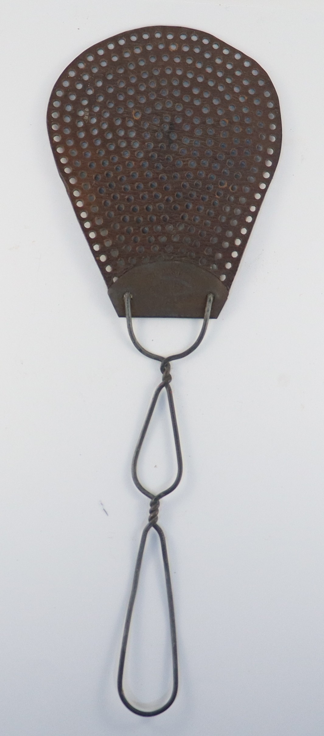 1900 - 1930A piece of brown pear shaped perforated leather attached to a metal plate which is then attached to a twisted metal handle.