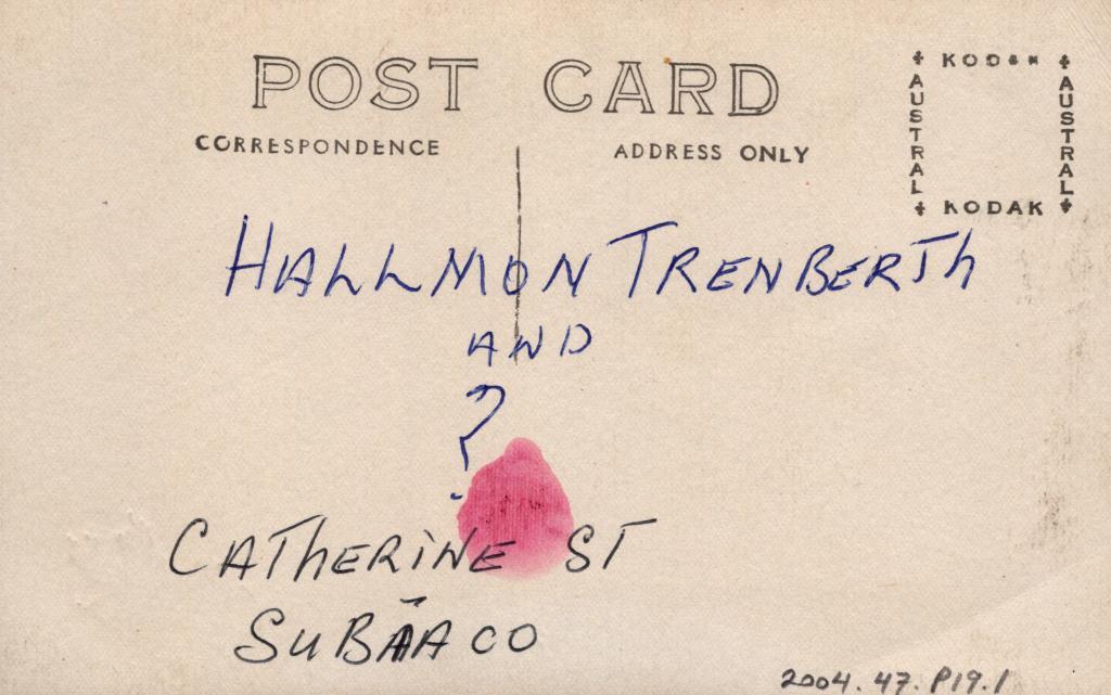 Reverse: Written in blue pen 'HALLMON TRENBERTH AND ?'. Written in black pen 'CATHERINE ST SUBIACO'