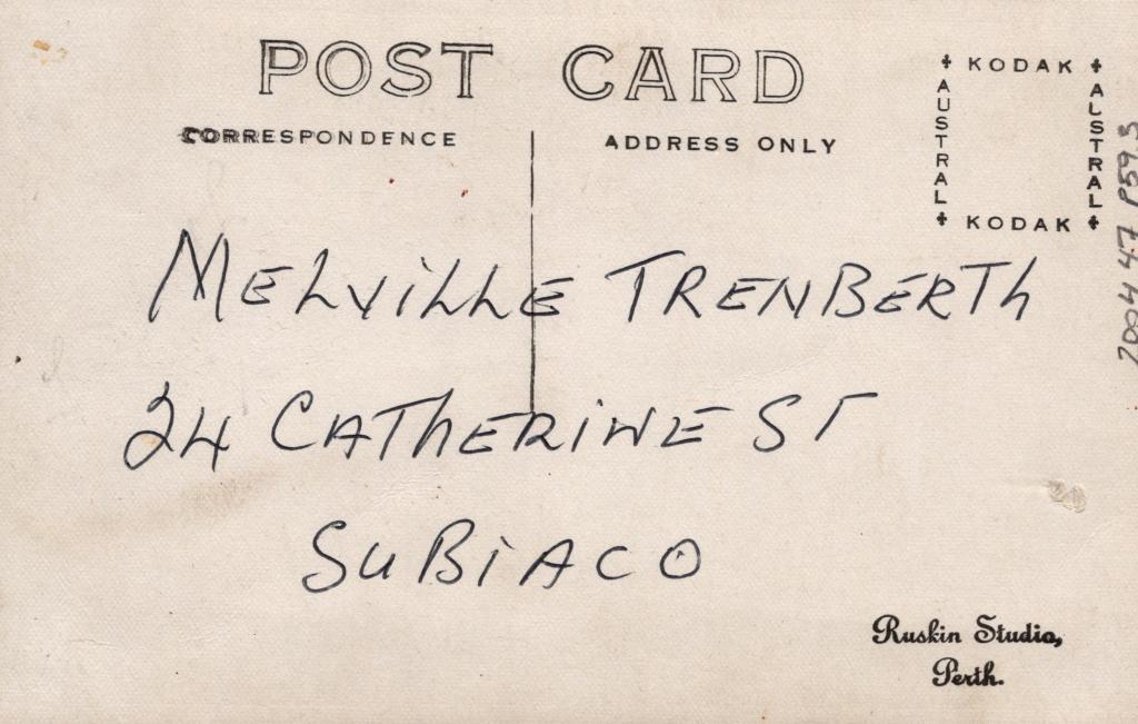 Reverse: Written in black pen 'MELVILLE TRENBERTH 24 CATHERINE ST SUBIACO'