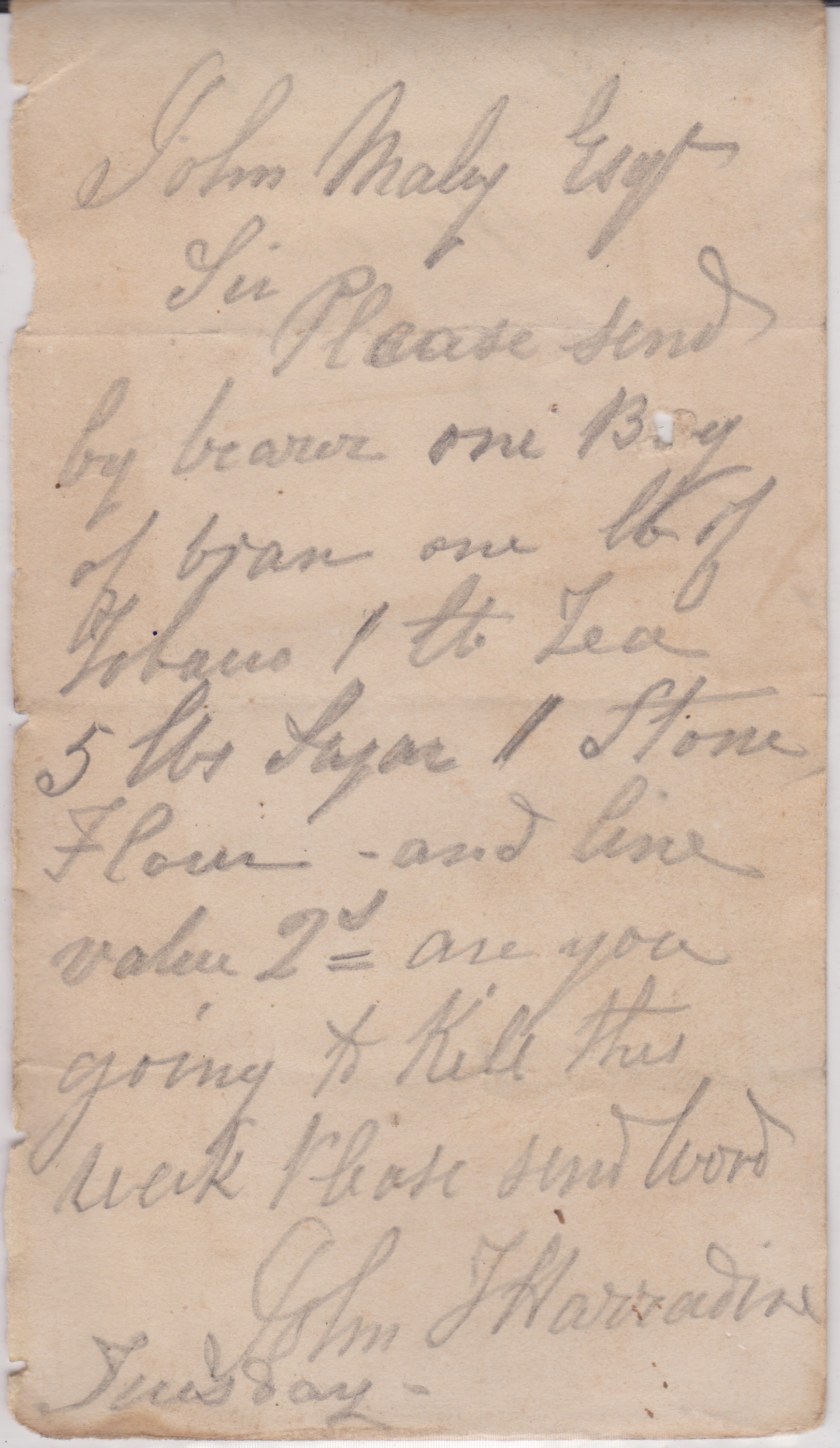 Sir Please send by bearer one Bag of bran one lb of Tobacco 1lb Tea 5lbs Sugar 1 Stone Flour and line value 2d are you going to kill this week Please send word